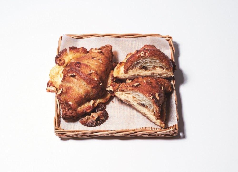 レストラン<タテルヨシノ>でシェフパティシエを経験した奥村充也シェフが務める東京・恵比寿のレストラン<Q.E.D.CLUB>。限定販売のクロワッサンティラミスはエスプレッソのシロップをたっぷりと染み込ませたクロワッサンにマスカルポーネとコーヒー豆のプラリネをサンドし、上にはヘーゼルナッツのフランジパーヌを絞り焼き上げたリッチな一品。リベイクはもちろん、少し冷やしてデザート感覚で楽しむのもおすすめです。