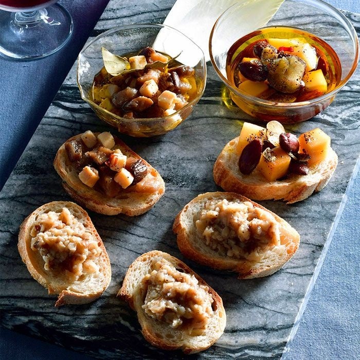 秋田県八峰町のオイル漬け専門店。ご覧の3品は、いぶりがっこ×チーズ、燻製チーズ×アーモンド、地元産椎茸のタプナード風と、秋田の素材を組み合わせたセンスが抜群。秋田の魚醤 「しょっつる」 などの旨みを含んだオリーブオイルに漬け、芳醇な味わいと新食感で魅了する。おもてなしにも向く酒肴です。