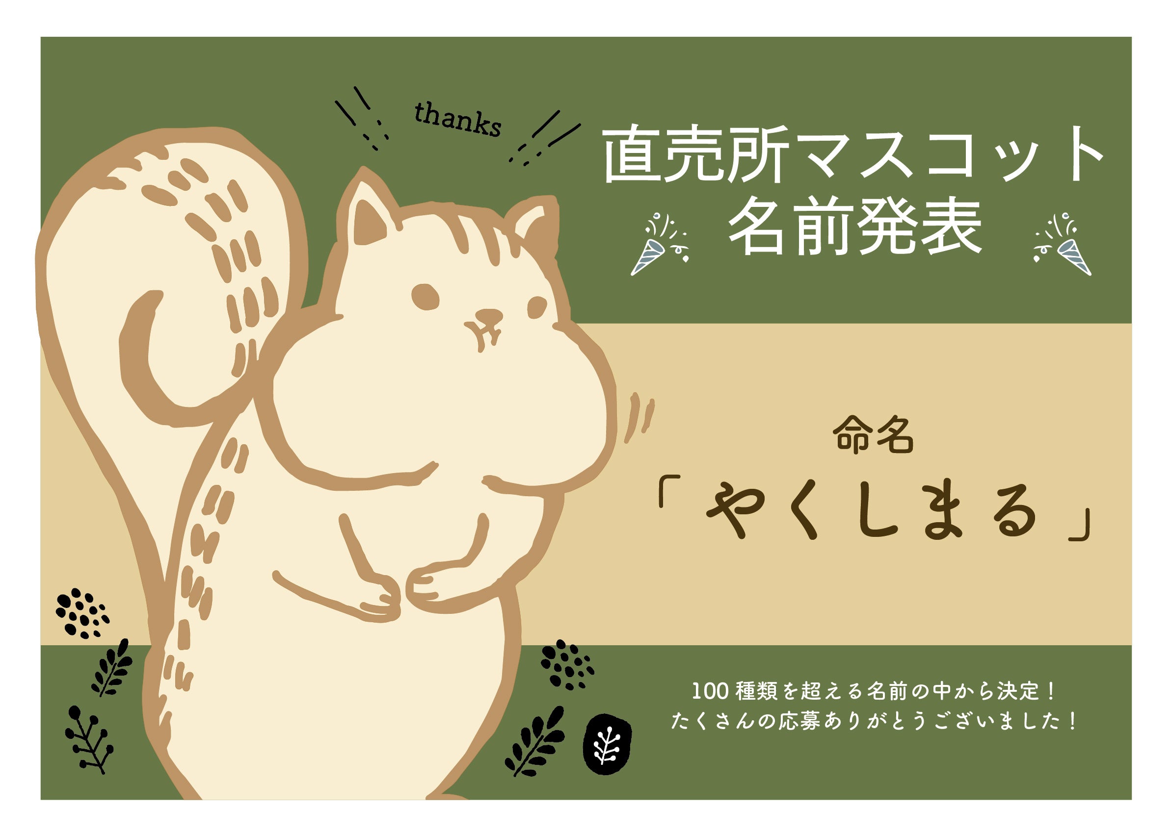 町田市にある町田薬師池公園四季彩の杜 西園の直売所にてリスのキャラクターが新登場!キャラクターの登場に合わせて名前の募集を行ったところ、多数の応募がありました!100種類以上の名前の中から投票にて「やくしまる」に決定いたしました。愛されキャラ「やくしまる」のプロフィールを紹介します。