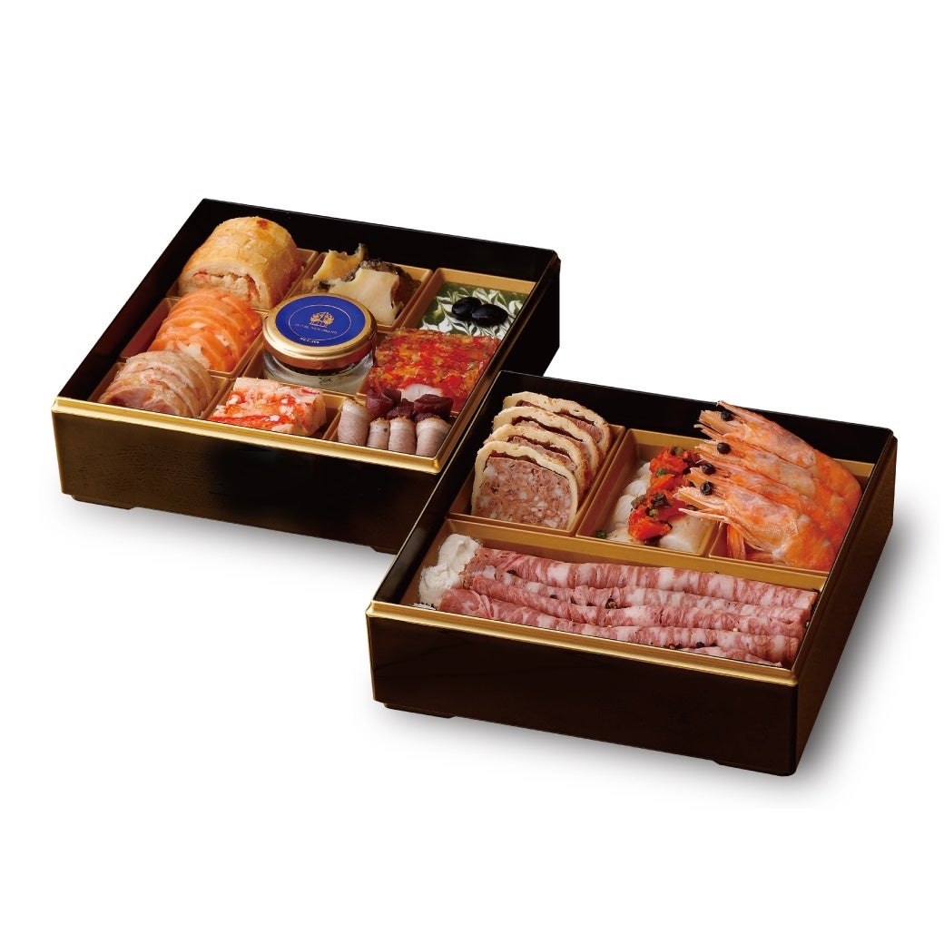 東京を代表する有名店が監修。両店の持ち味を生かした和・洋・酒の肴の贅沢な三段重です。