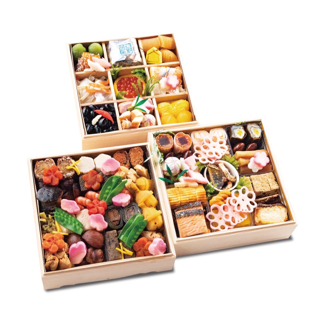 寿ぎのひとときにふさわしいこだわりの品を詰め合わせた和・洋・中の三段重です。