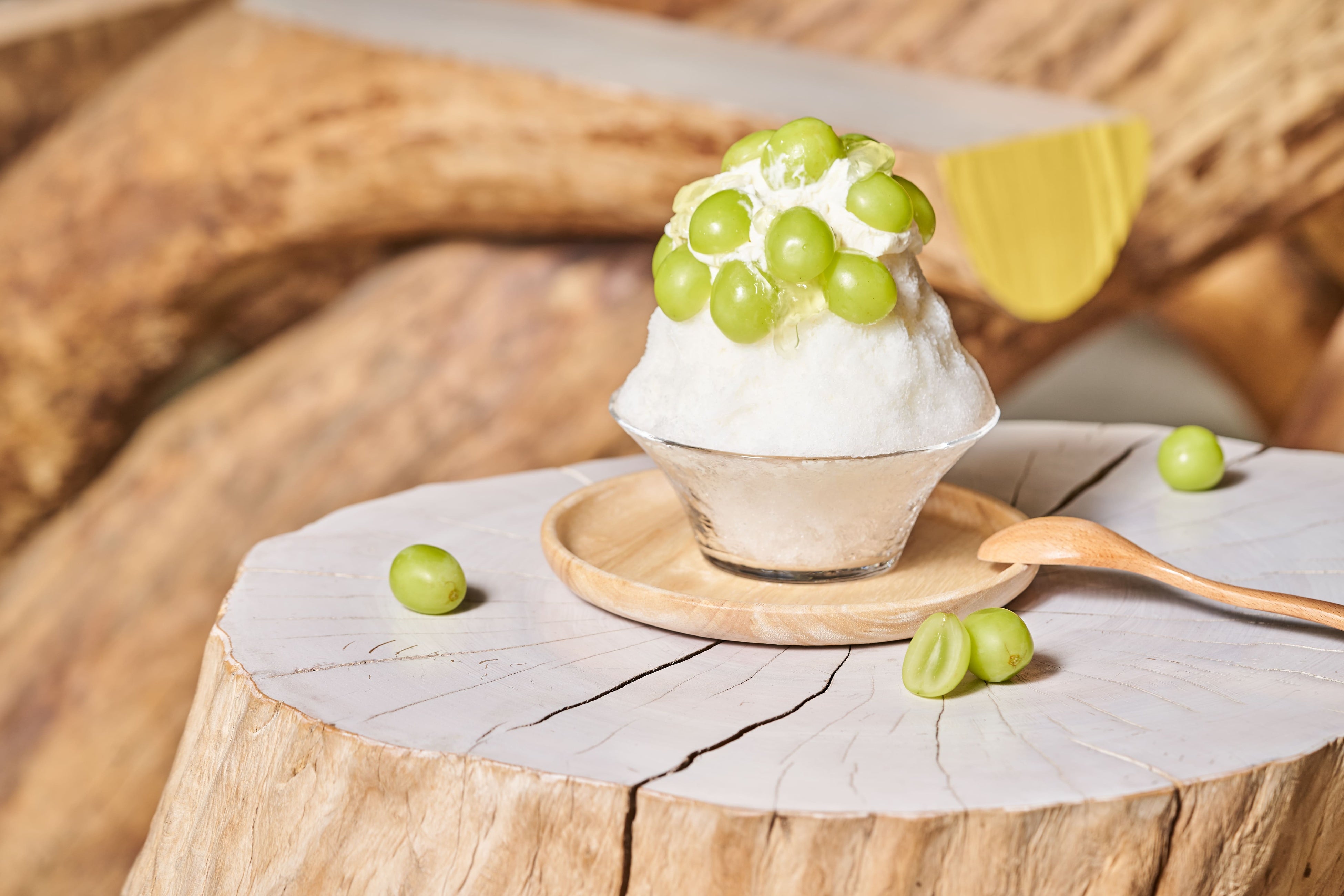 天然水を使用したふわふわかき氷にチーズソースをたっぷりかけました。シャインマスカットと酸味の効いたマスカットゼリーが爽やかな、ちょっとリッチなかき氷です。