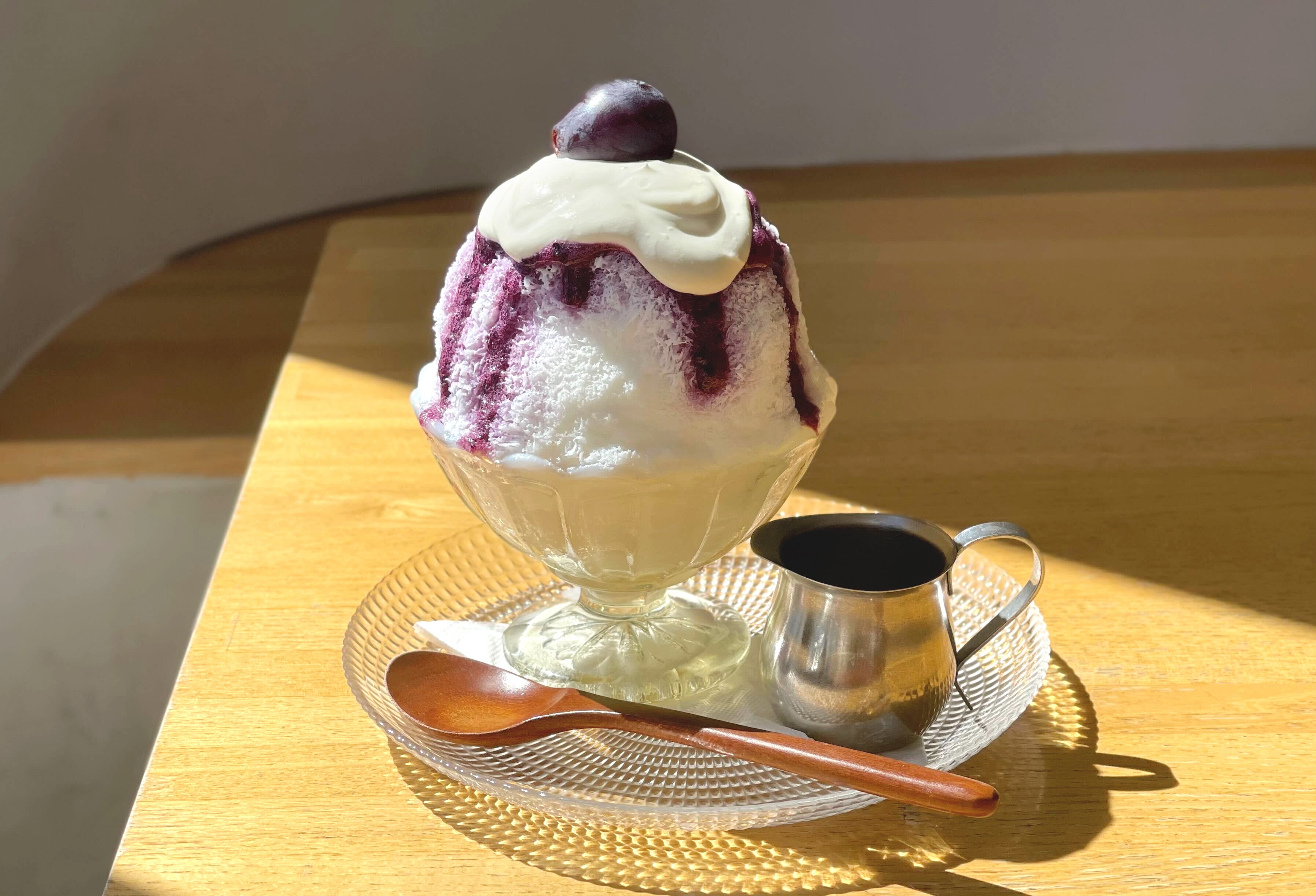 ちょっと大人なかき氷。ふんわり削ったミルク氷に、中には巨峰アイス、ラム酒香る自家製マロンソースが入ってます!外には濃い巨峰ソースとヨーグルトクリーム、巨峰をのせました!巨峰とマロンの組み合わせは秋の訪れを感じさせます。