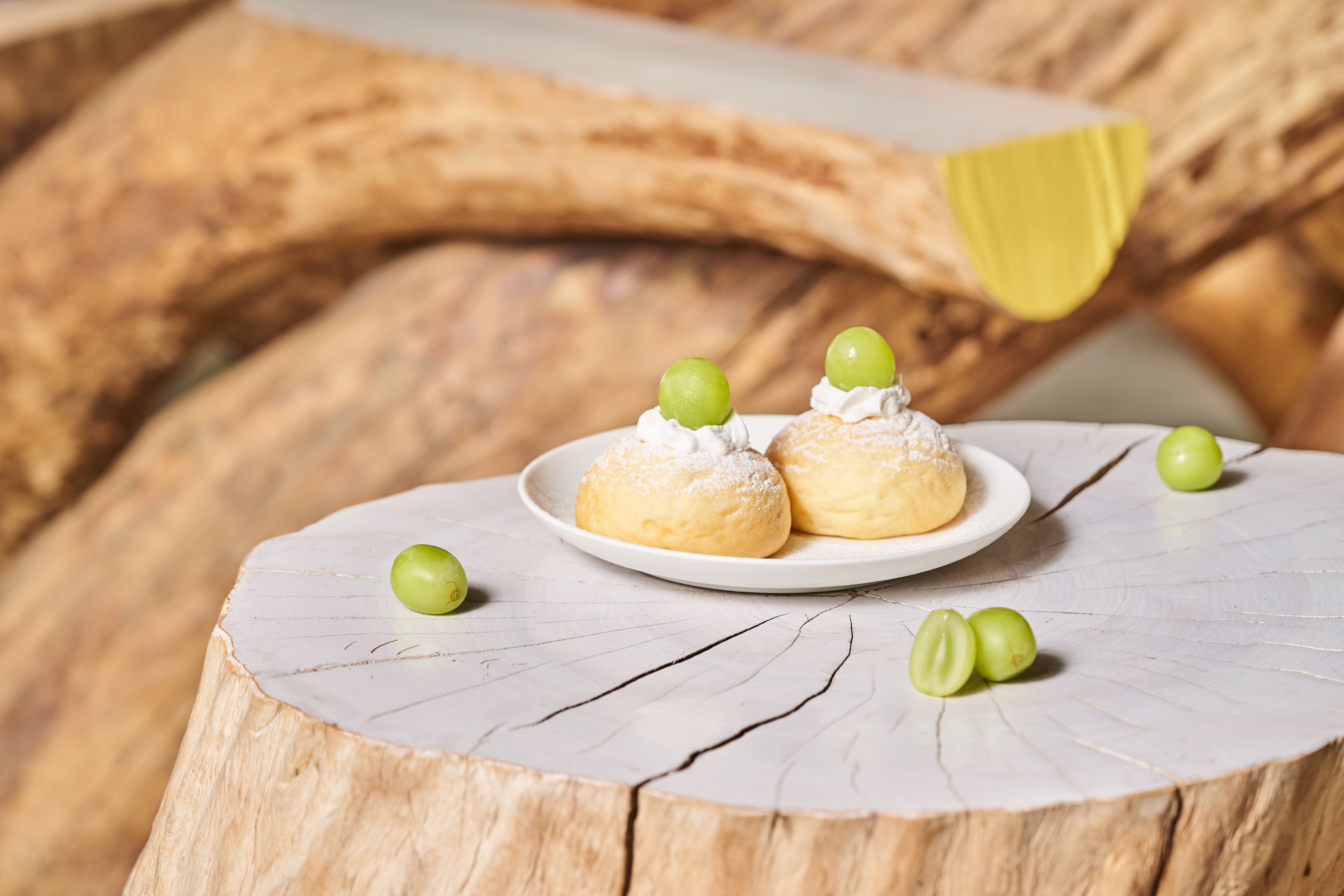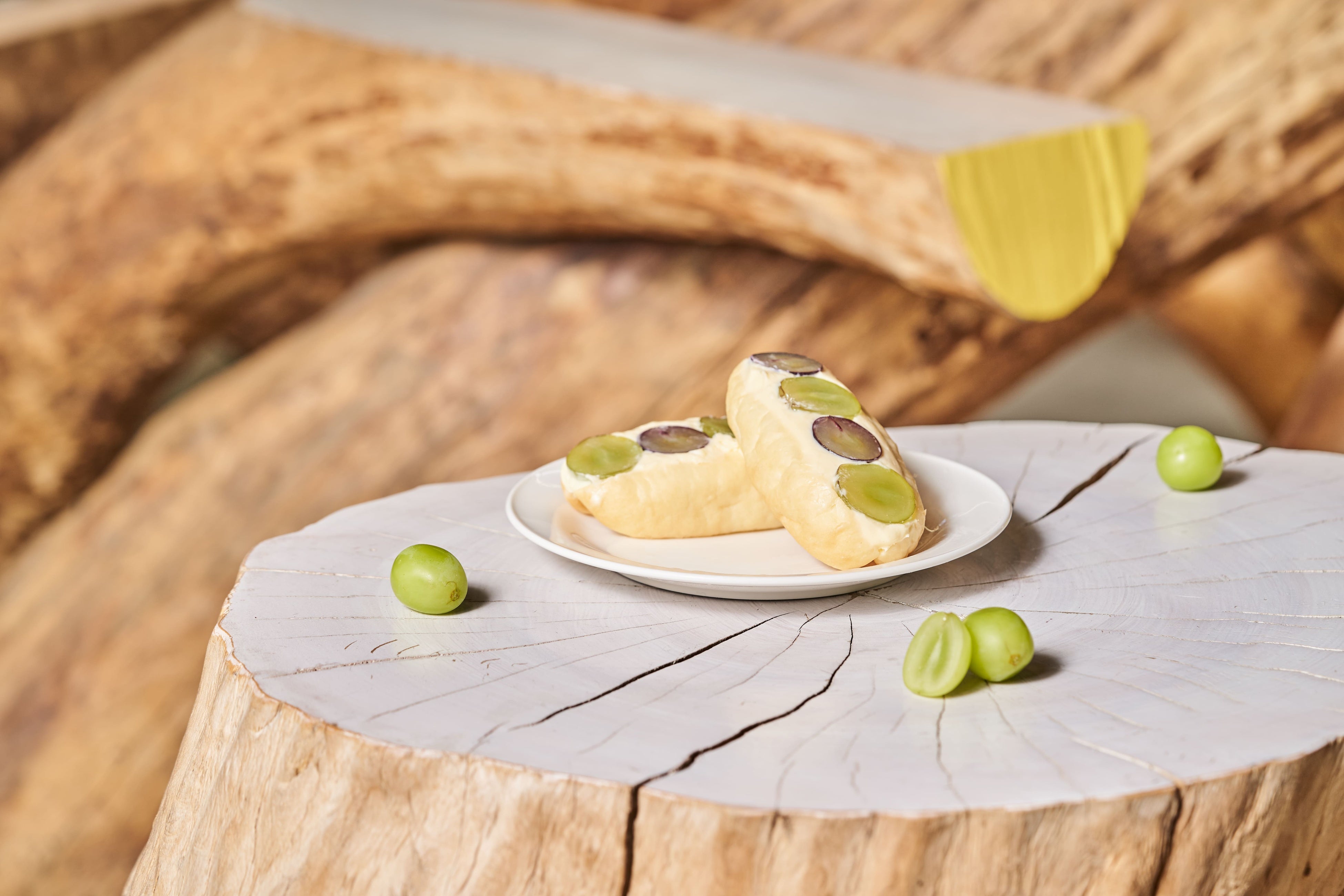 しっとりとした甘いもちもちの生地に、あんこと生クリームをたっぷりと入れ、上にはシャシンマスカットをトッピング。秋らしい大福みたいなパンです。