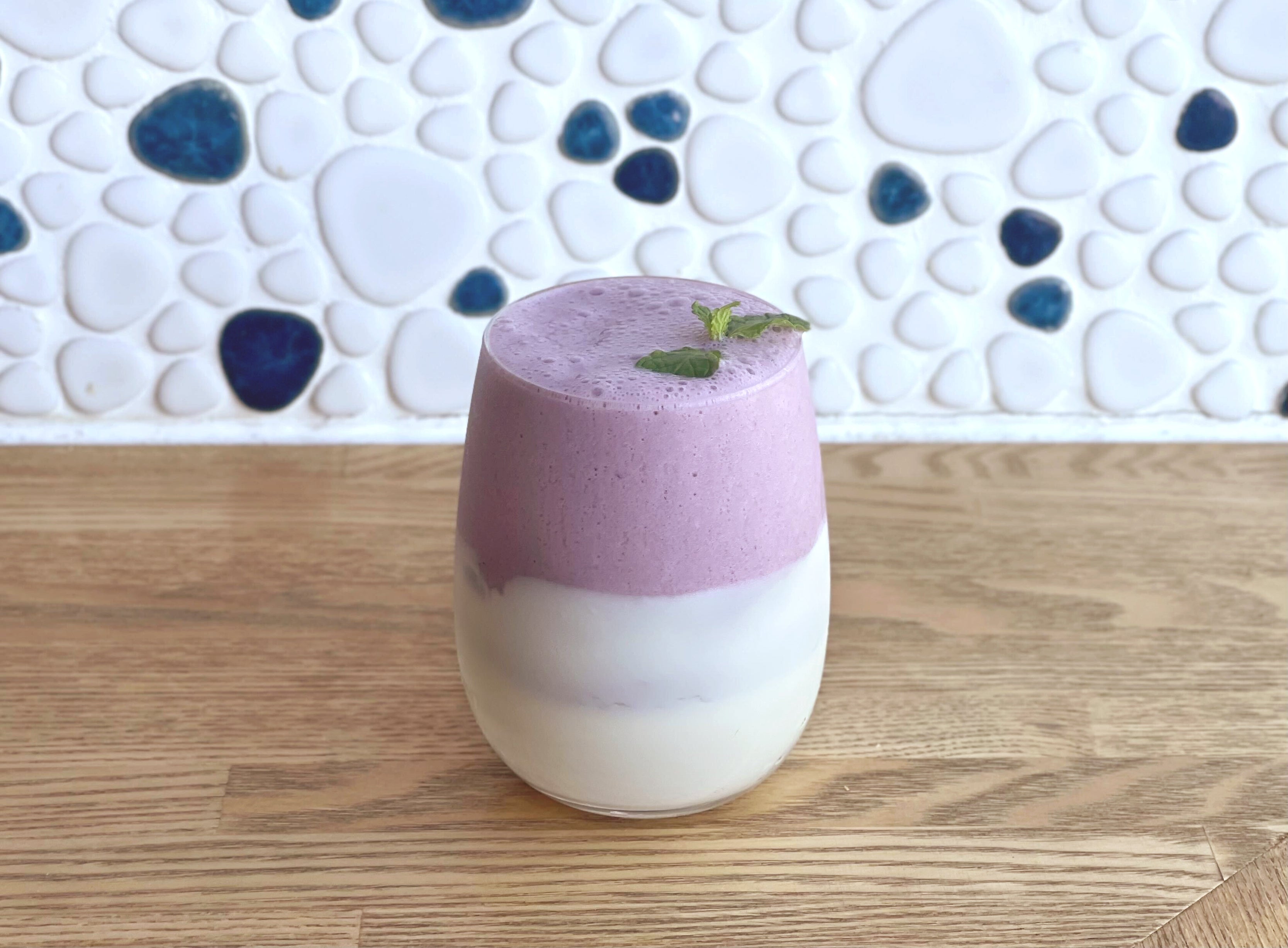 ヨーグルトと練乳を入れ、そこに巨峰シロップ、氷、巨峰アイスをシェイクしたものを注ぎみました!2層混ざり合うとさっぱりとした味わいのラッシーに仕上がります!濃厚な甘味がクセになります!