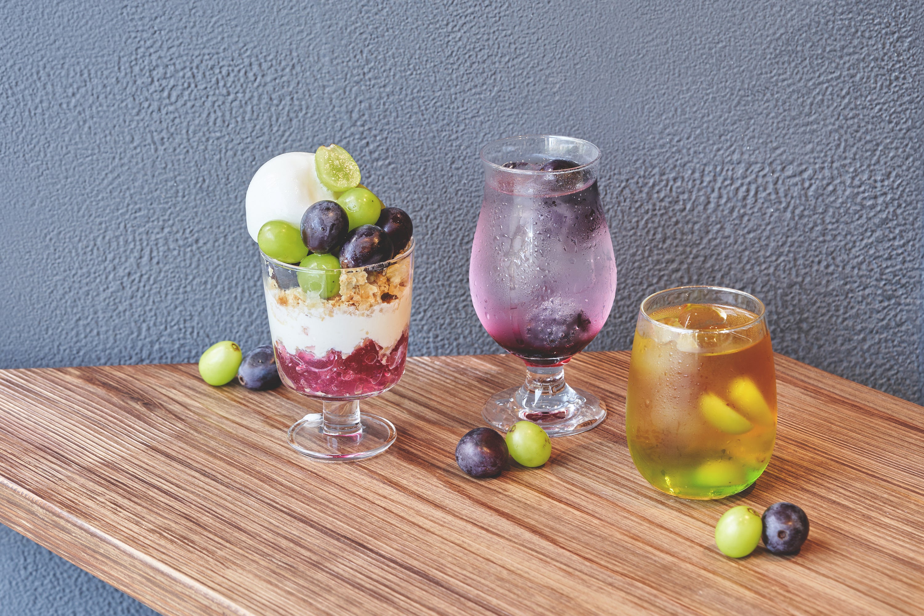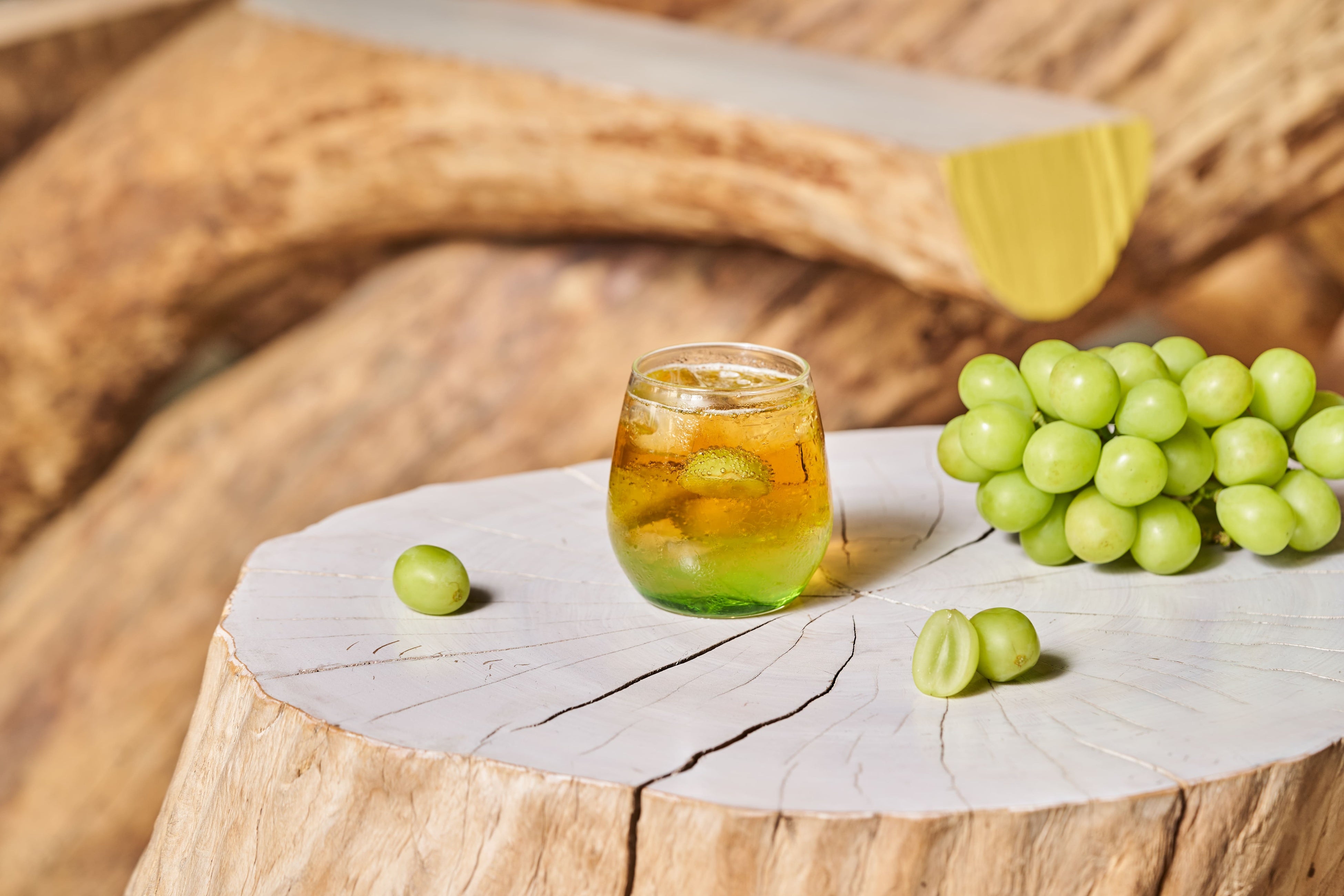 マスカットシロップと自家製のぶどうジャムと凍らしたぶどう果肉入り!飲みごたえのある秋の炭酸ドリンク。