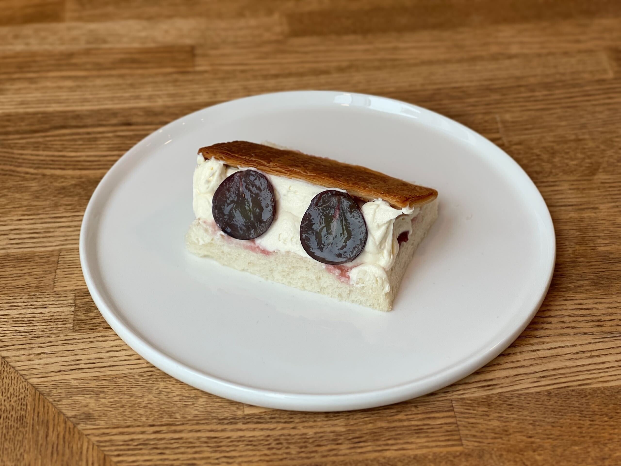 ふわふわしっとりと焼き上げた甘めの生地にクリームチーズカスタードをたっぷりと絞り、シャシンマスカットとピオーネを挟んださっぱりしたフルーツサンドです。