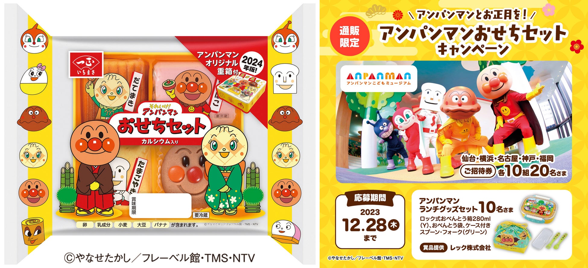 アンパンマンキャラクター入りのかわいいミニお重箱で、ご家族とご一緒にお重詰めを楽しめます。当社の通信販売で「アンパンマンおせちセット」をご購入いただいた方の中から抽選で110名さまに、「アンパンマンこどもミュージアム招待券」、または「アンパンマンランチグッズセット」をプレゼントします。