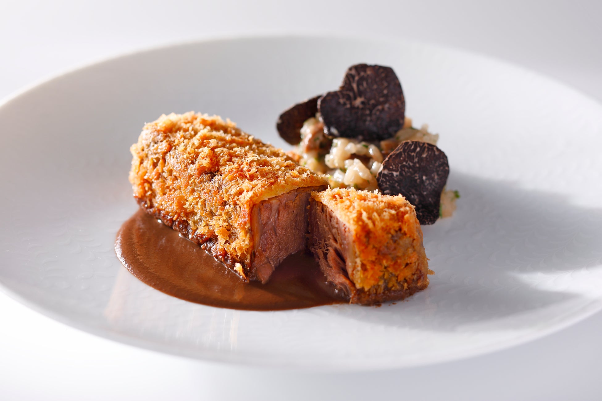 希少な東京ブランドの黒毛和牛「秋川牛」を使用し、柔らかで味わい豊かなカツレツを幻の茸と言われる香茸ソースと共に味わいを深め、黒トリュフとポルチーニのリゾットを添えた秋の訪れを感じる一皿です。