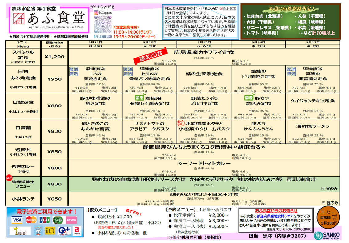 また10月の「おさかなの日(10月10日)」には、処理水問題により輸出で苦しんでいる産地にスポットを当て、この問題を考えるきっかけづくり、そして産地を応援することを目的として、あふ食堂のみならず、当社運営受託店舗の各省庁(6省庁10拠点)にて、ホタテメニュー及び常磐もの水産物商材を利用したイベントメニューの準備を進めております。