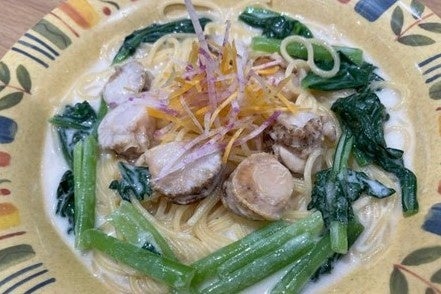 プリプリとした食感の甘味のあるホタテと、シャッキとした有機野菜小松菜に、クリーミーソースの相性が抜群の1品です。