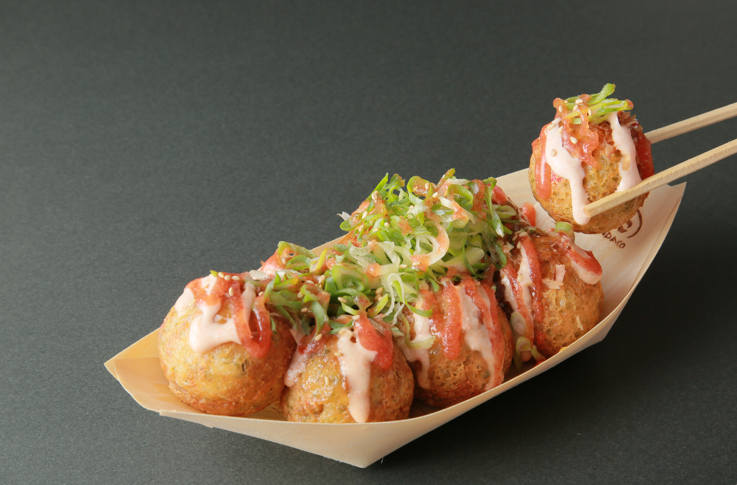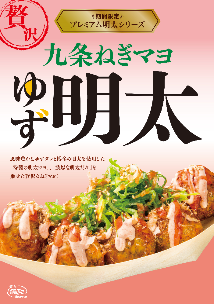 期間限定 プレミアム明太シリーズ『九条ねぎマヨ ゆず明太』は、 “明太好きにはたまらない!” 初のプレミアム明太シリーズで、丁寧に焼き上げたアツアツのたこ焼に、さわやかで風味豊かな徳島県産ゆずを使用した「ぽん酢だれ」に、「削り節」、特製「明太マヨ」をかけ、その上にシャキシャキ食感の「九条ねぎ」をたっぷりのせて、仕上げに “博多明太使用” の濃厚な特製「明太だれ」をかけ、最後に香ばしい「炒り白ごま」をトッピングしました!