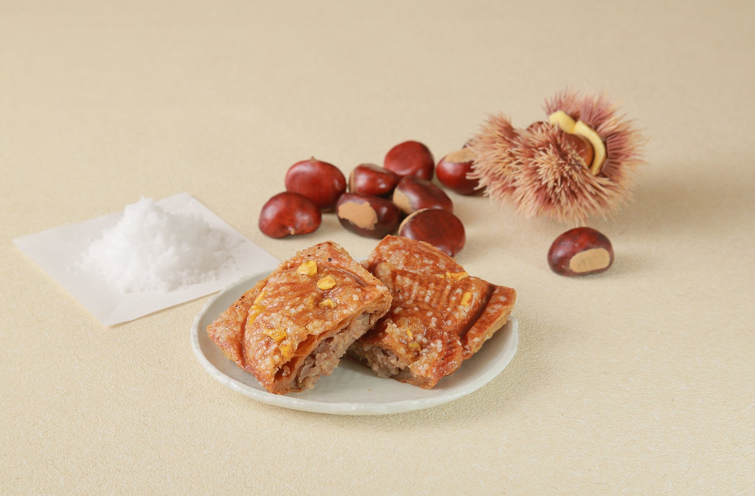 クロワッサンたい焼ファン待望の秋の新作、今年は『塩栗』に決定!たい焼の主役となる餡は、大きめにカットした栗がゴロッと入っており、餡全体の約4割以上に栗を使用している贅沢な特製甘栗あん。マロンペーストを練り込んだオリジナル生地で、甘さ控えめの特製甘栗あんを包み込み、生地の表面(片面のみ)には “ザラメ糖” と “岩塩をまぶした蜜漬けの甘栗” をトッピングし、両面から香ばしく焼き上げました。栗を引き立てる “岩塩” の “甘じょっぱさ” が癖になる新感覚のクロワッサンたい焼を、秋の訪れと共にぜひお楽しみください!