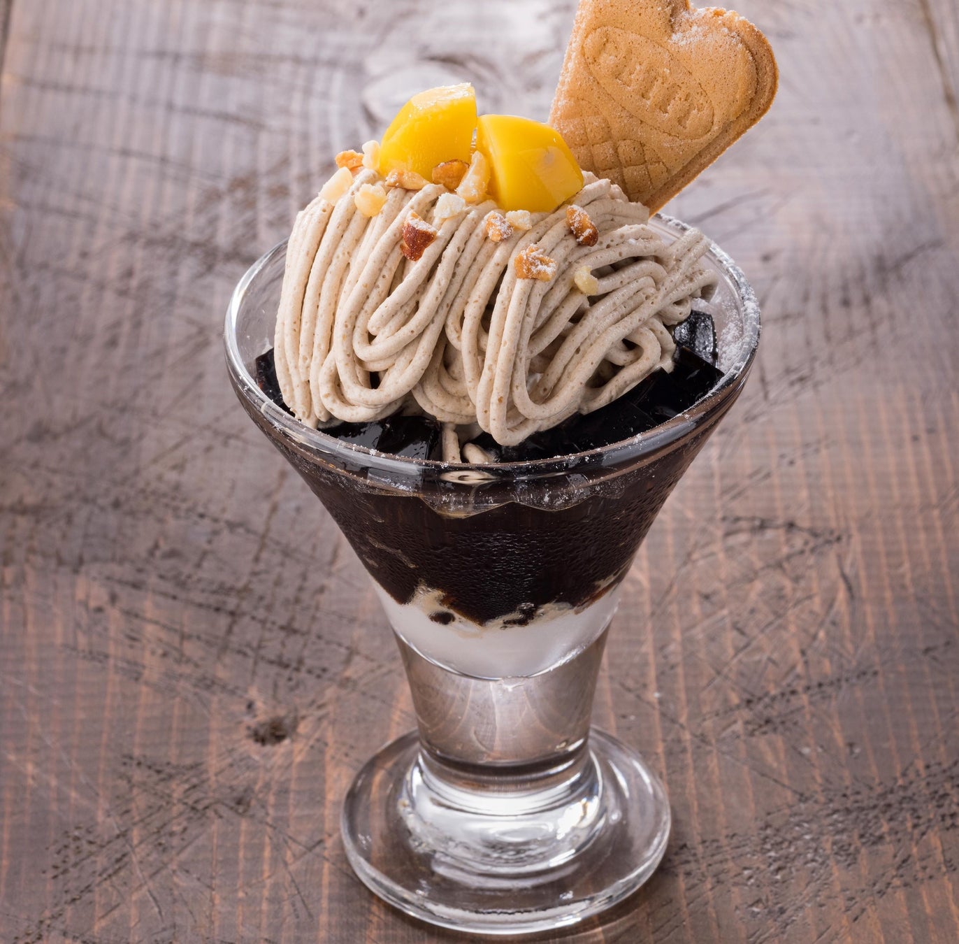 ほろ苦い珈琲ゼリーに渋皮栗アイスとマロンホイップをトッピングしました。