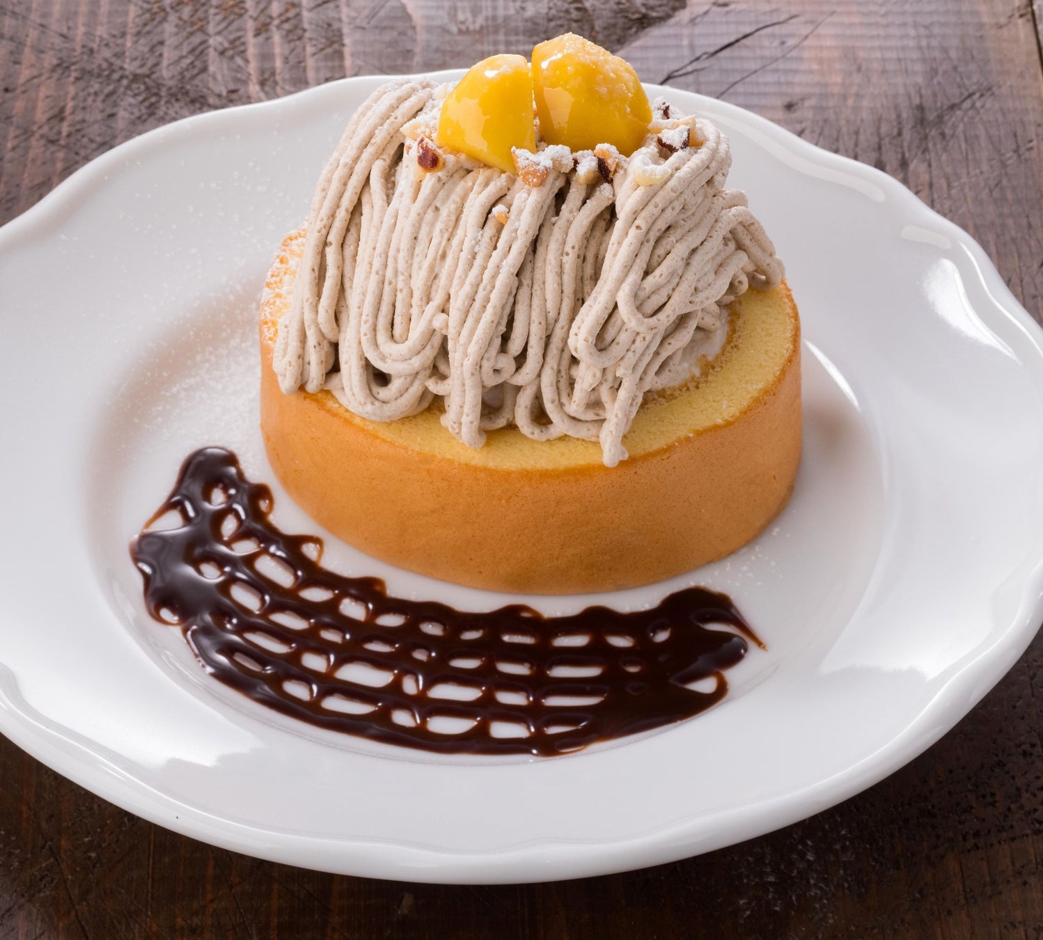 渋皮栗アイスとマロンホイップをトッピングして、チョコレートソースを添えました。