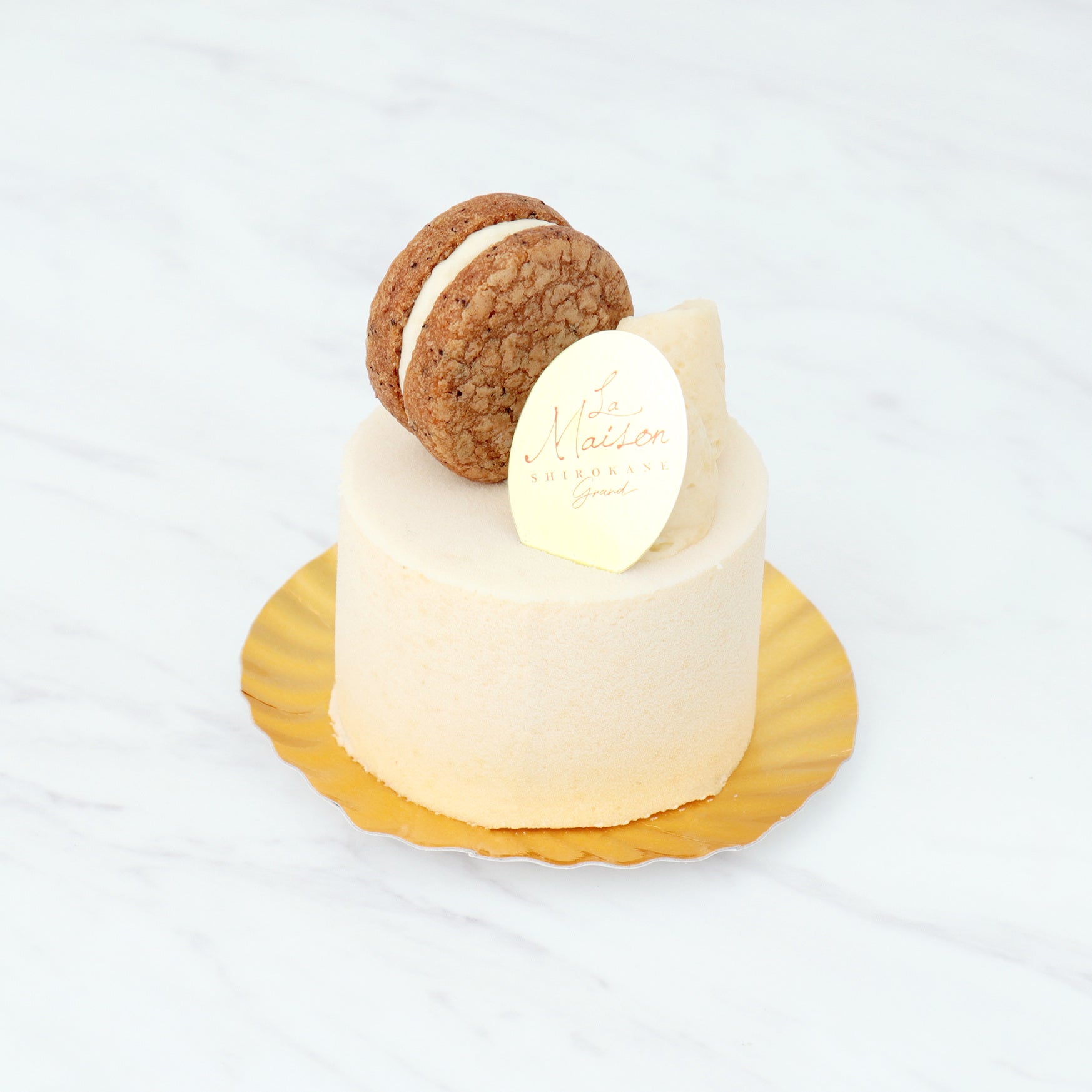 りんごのブリュレをりんごと紅茶のムースで包み、紅茶クッキーサンドをトッピング