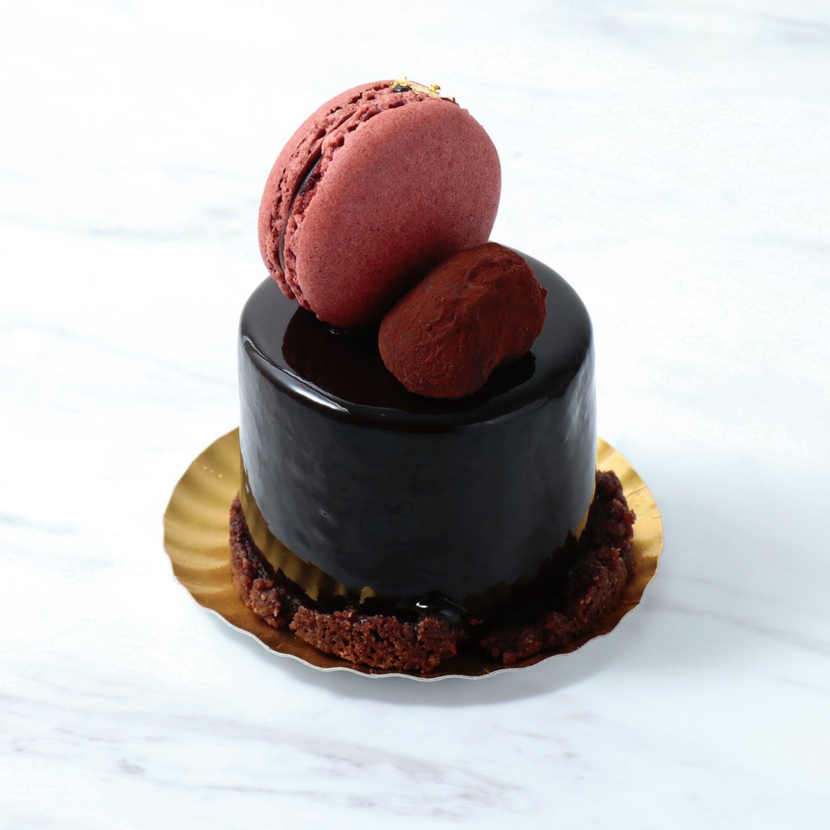 カカオ分70%のショコラ「グアラナ」を使用したショコラクリームとビスキュイショコラをショコラ「イランカ」のムースで覆ったチョコレートケーキ