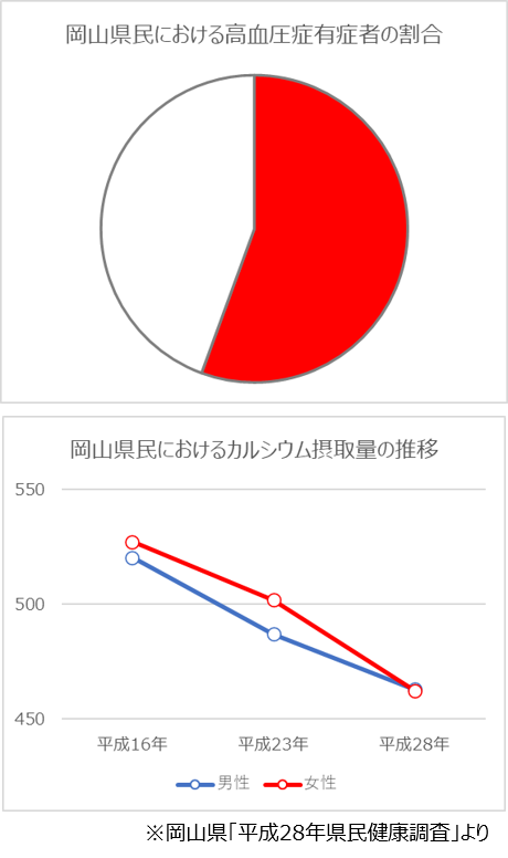 県が平成28年に実施した調査では、岡山県民の2人にひとり以上が高血圧症の有症者であることが分かっています(20歳以上が対象)。