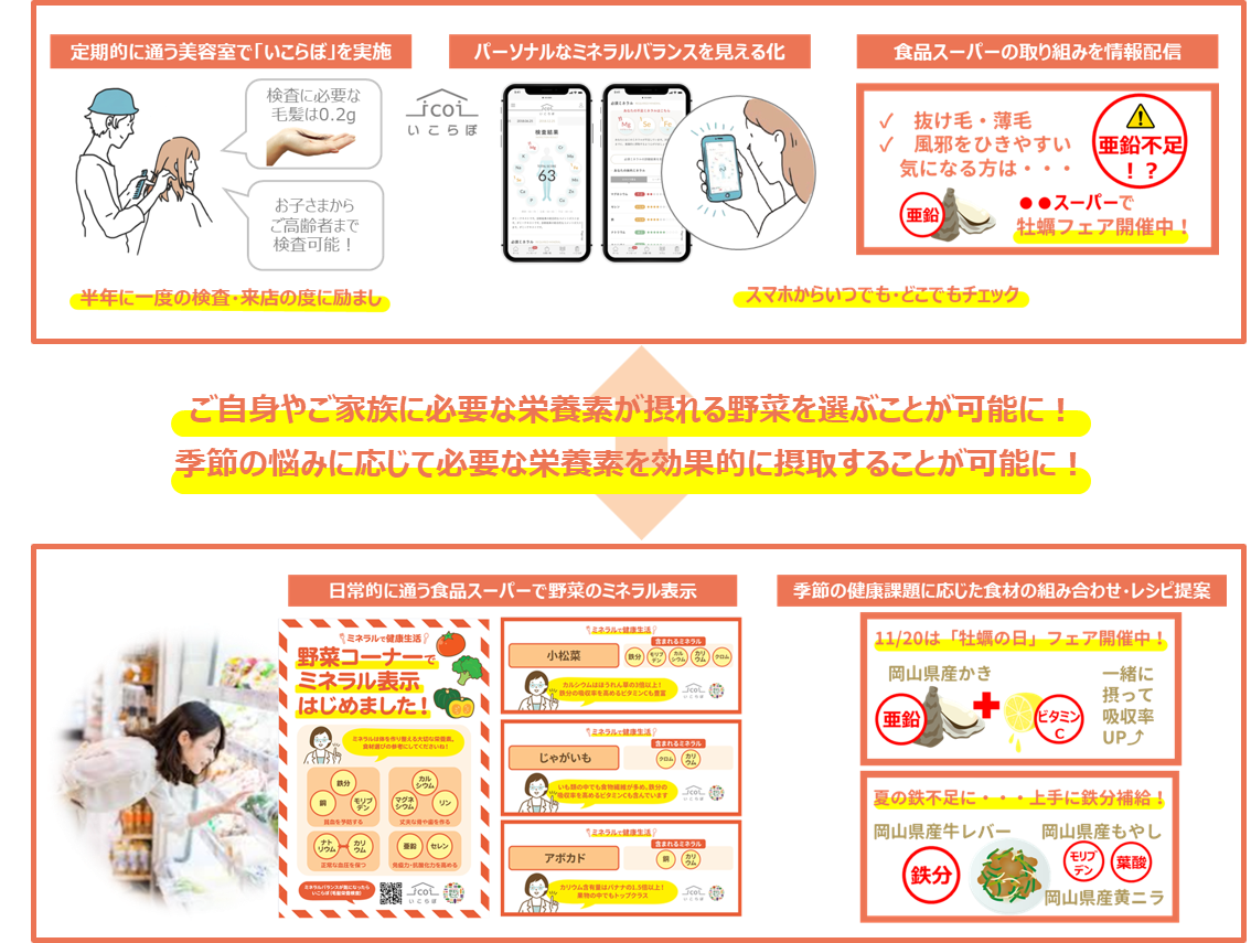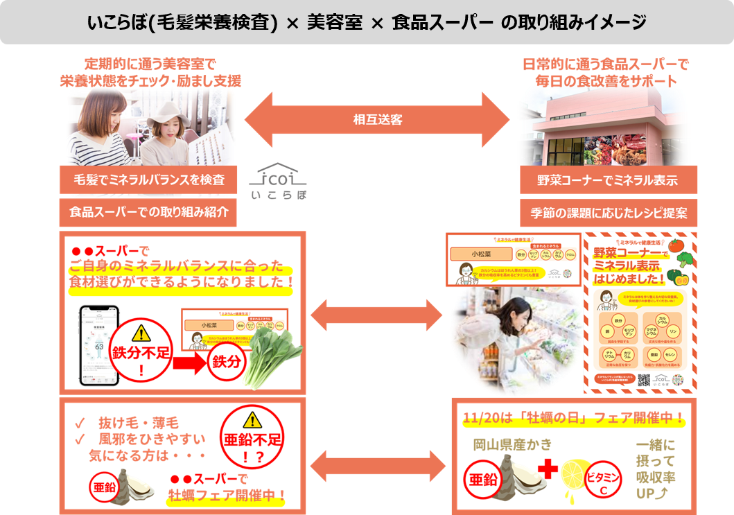 icoiが提携する美容室で「いこらぼ(毛髪栄養検査)」を提供し、パーソナルなミネラルバランスを見える化します。近隣の食品スーパーでは、各野菜に含まれるミネラル表示を行います。これにより「いこらぼ」で明らかになった個々人のミネラルバランスに合わせ、改善を促すために必要な食材を購入することが可能になります。さらに食品スーパーでは、寒さに備えた温活、汗をかく時期のミネラル不足など、季節特有の悩みに応じた栄養素を効果的に摂取できる旬の食材の組み合わせやレシピの提案を行います。これらの情報は美容室からも発信することで、相互送客を図ります。(現在、食品スーパー42店、美容室21店を双方順次拡大)