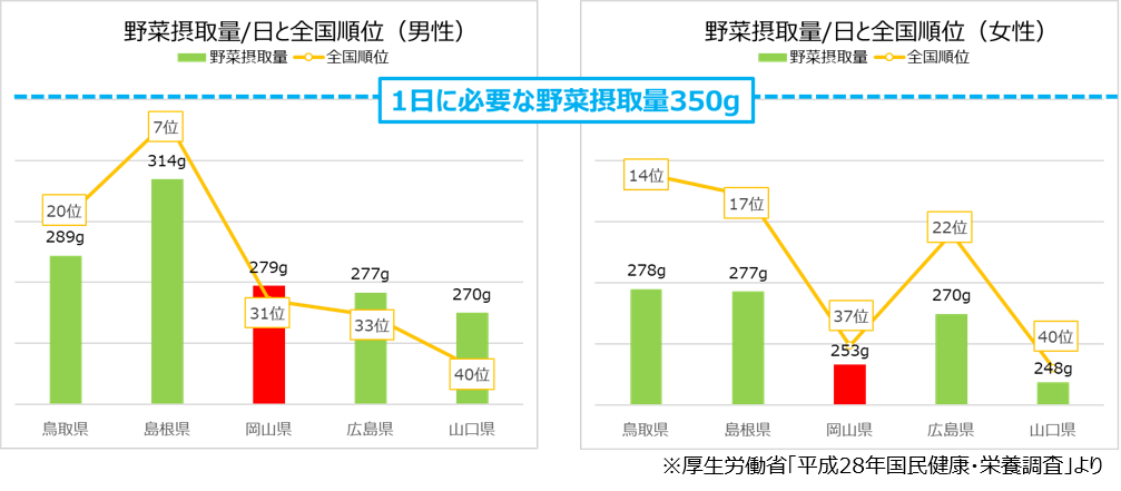 岡山県民の1日野菜摂取量の平均は、男性279g・女性253gで、全国と比較して少ない傾向にあります。全国ランキングを見ても、男性31位・女性37位と低迷しています。