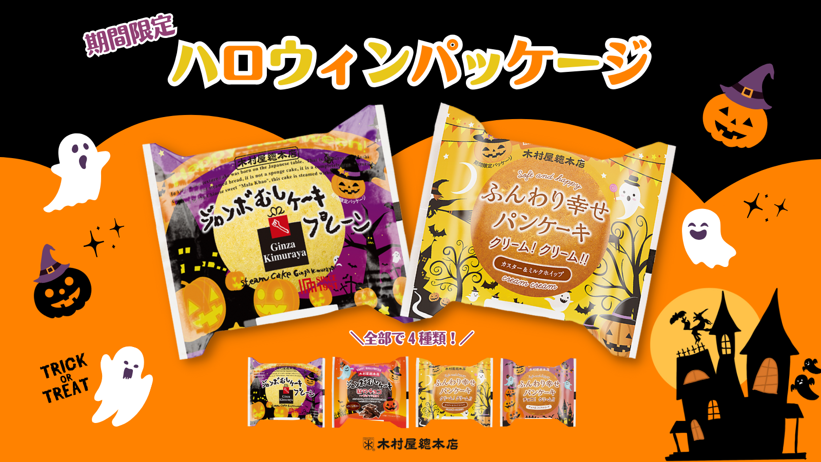 可愛いおばけや、ジャック・オー・ランタンのイラストが入った期間限定パッケージが登場。「ジャンボむしケーキ」「ふんわり幸せパンケーキ」から全4種類発売します。朝食やおやつ、パーティーにもおすすめ。手軽にハロウィンをお楽しみいただける商品となっております。