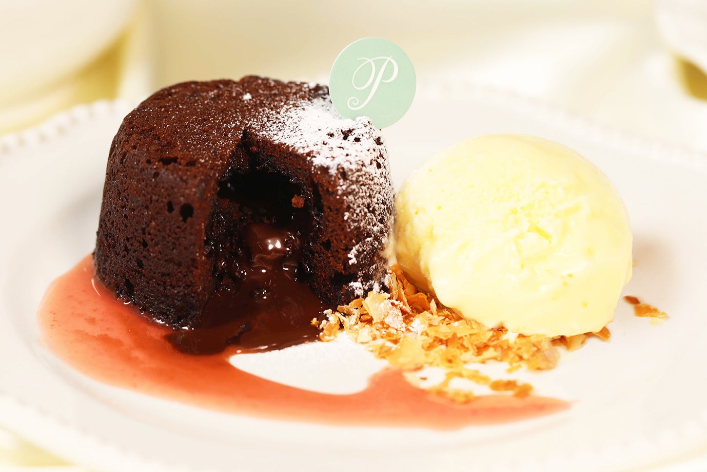こだわり:しっとり、軽い食感のガトーショコラにガナッシュを入れて焼き上げた「ピネード 有明店」店舗限定カフェメニューです。温かくふんわりとした濃厚なチョコレートケーキと、とろっと広がるチョコソースが冷たいアイスクリームとよく合います。他のピネード店舗では味わえない、有明店のみでお楽しみいただけるフォンダンショコラです。