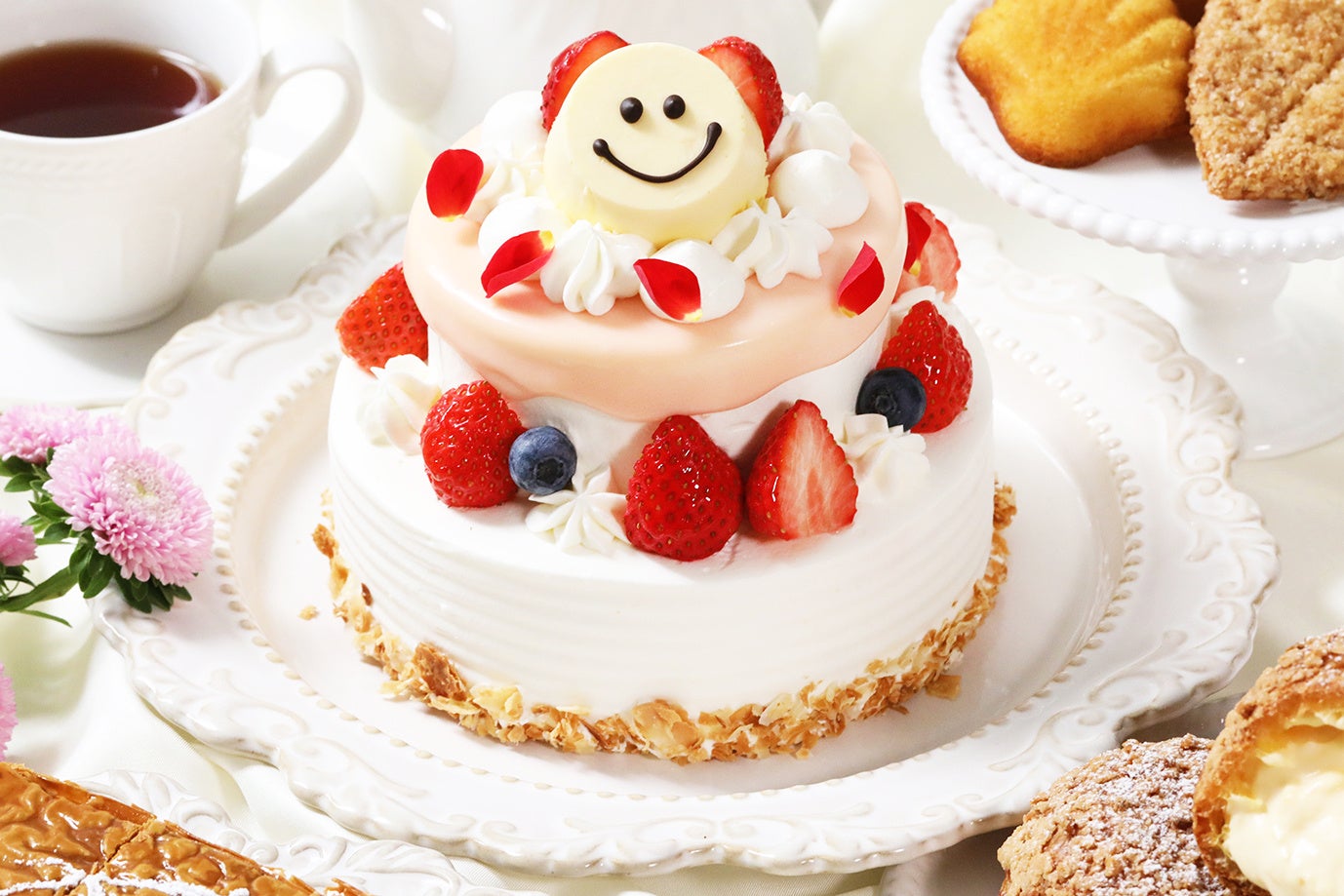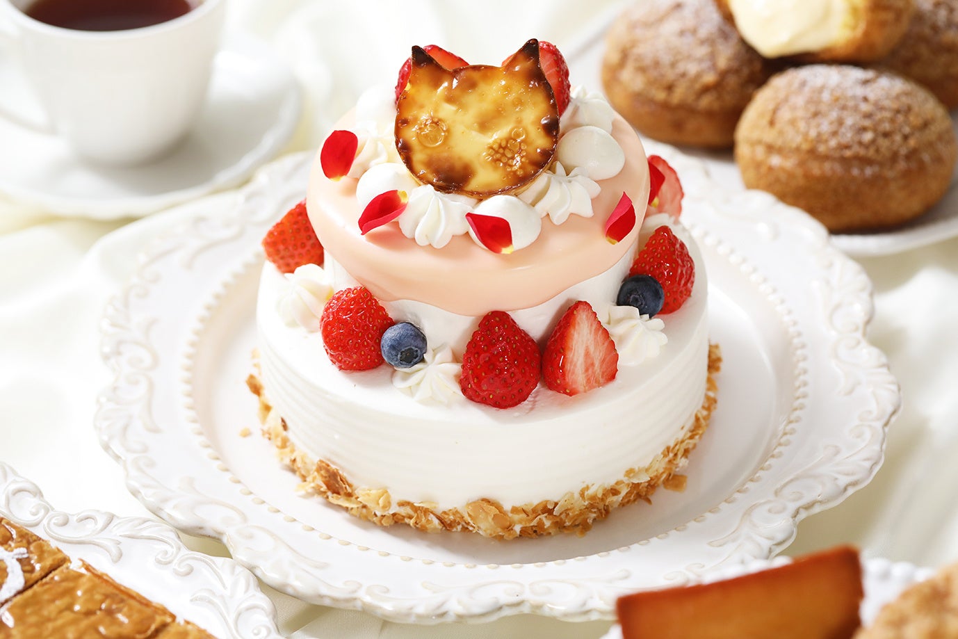 真っ白なケーキに優しいピンク色のグラサージュといちご、ブルーベリーを飾り、仕上げは「パティスリーピネード」の人気商品『さらにおいしいチーズケーキ』または同社が運営する「ねこねこ」の人気商品『にゃんチー』の どちらかを選んでトッピングいたします。『さらにおいしいチーズケーキ』にはお好きなメッセージやお名前をお入れすることも可能のため、誕生日や記念日のお祝いにもぴったりです。