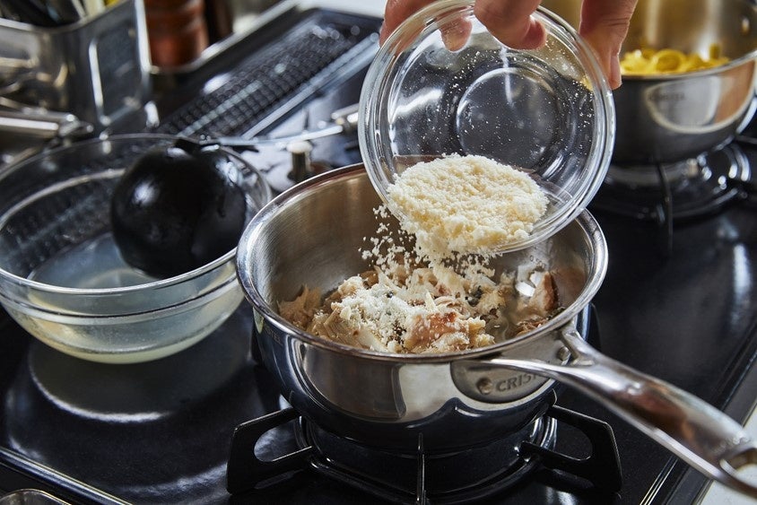 2. 粉チーズを入れ、リゾットを仕上げ、塩胡椒で味をととのえる。