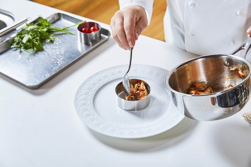 1. セルクルにサバのポシェを合わせた①のトマトコンフィを詰める。
