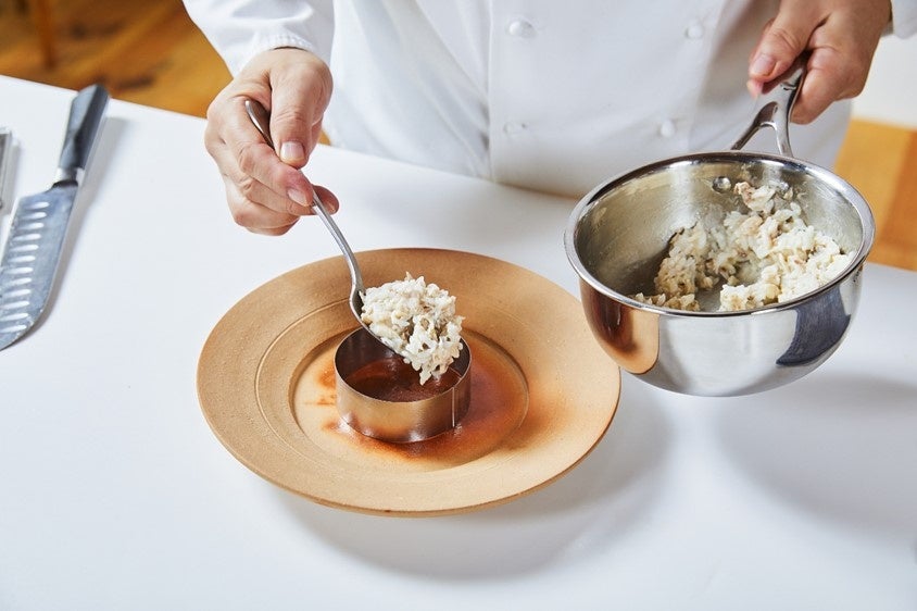 1. セルクルにサバを合わせた②のリゾットを詰める。