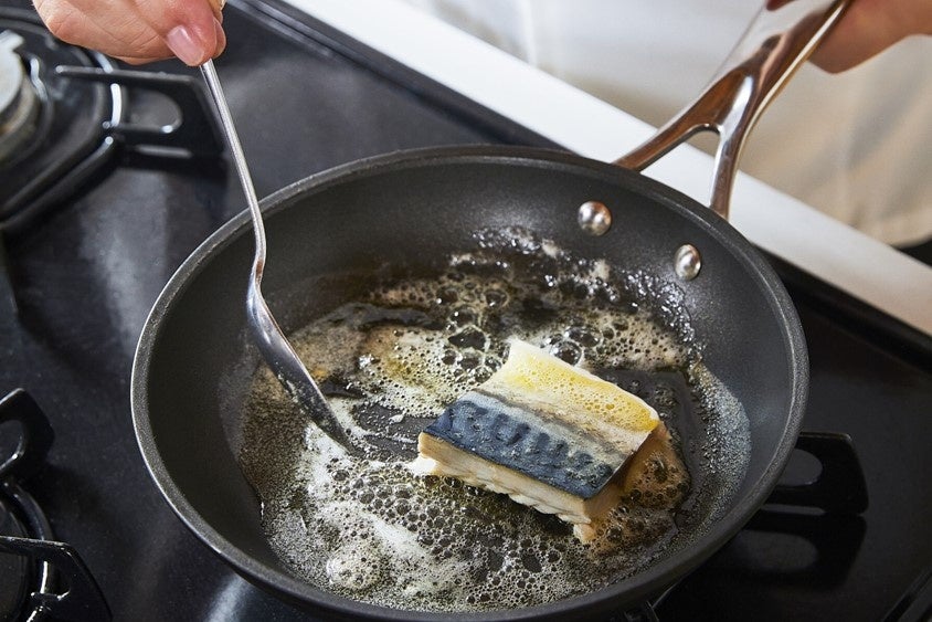 1. フライパンにバターを熱し、サバの身から焼く。皮面はアロゼする。