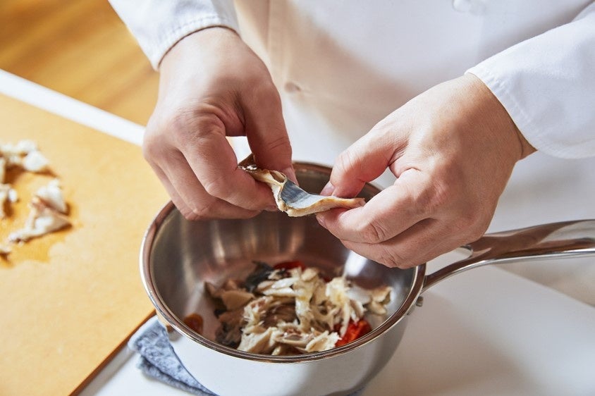 2. 取り出して、サバの骨をとる。茹で汁は漉しておく。