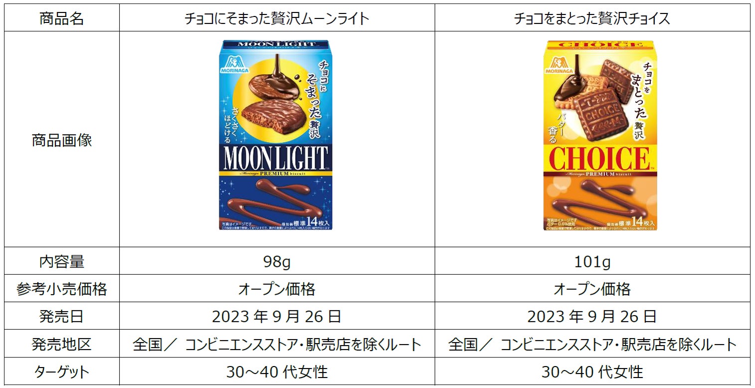 森永製菓株式会社(東京都港区芝、代表取締役社長・太田 栄二郎)は、「森永ビスケット」シリーズの中でも人気のサクサクほどける食感や卵のコクのある味わいが特長のクッキー「ムーンライト」と、サクッと、ホロっとした食感と、ふわっと香ばしいバターの味わいが特長のビスケット「チョイス」の贅沢シリーズである「チョコにそまった贅沢ムーンライト」と「チョコをまとった贅沢チョイス」を9月26日(火)より新発売いたします。