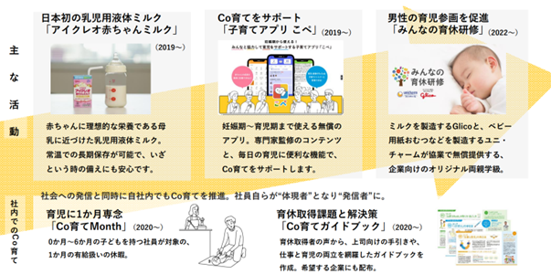 昨今の育児においては、社会環境の変化により、ワンオペレーション育児やマタハラ・パタハラ、産後うつ、子どもの自己肯定感の低下など、複雑で多様な問題が顕在化しています。Co育て(こそだて)PROJECTは、そのような育児の課題に対し、パートナーや周りの家族が協力し、育児環境をよりよくすることで、生まれてくる子どもたちのココロとカラダの健やかな成長を目指す取り組みとして、江崎グリコが2019年2月から開始しました。現在では、日本初の乳児用液体ミルク「アイクレオ赤ちゃんミルク」やCo育てをサポートするアプリ「こぺ」といった商品・サービスの展開はもちろん、男性の育児参画を促進する企業向けセミナー「みんなの育休研修」の実施、社員が1か月育児に専念する社内制度「Co育てMonth」を導入し、社内の男性育休取得率100%*の継続的達成など、社内外において育児環境の向上にむけて活動しています。