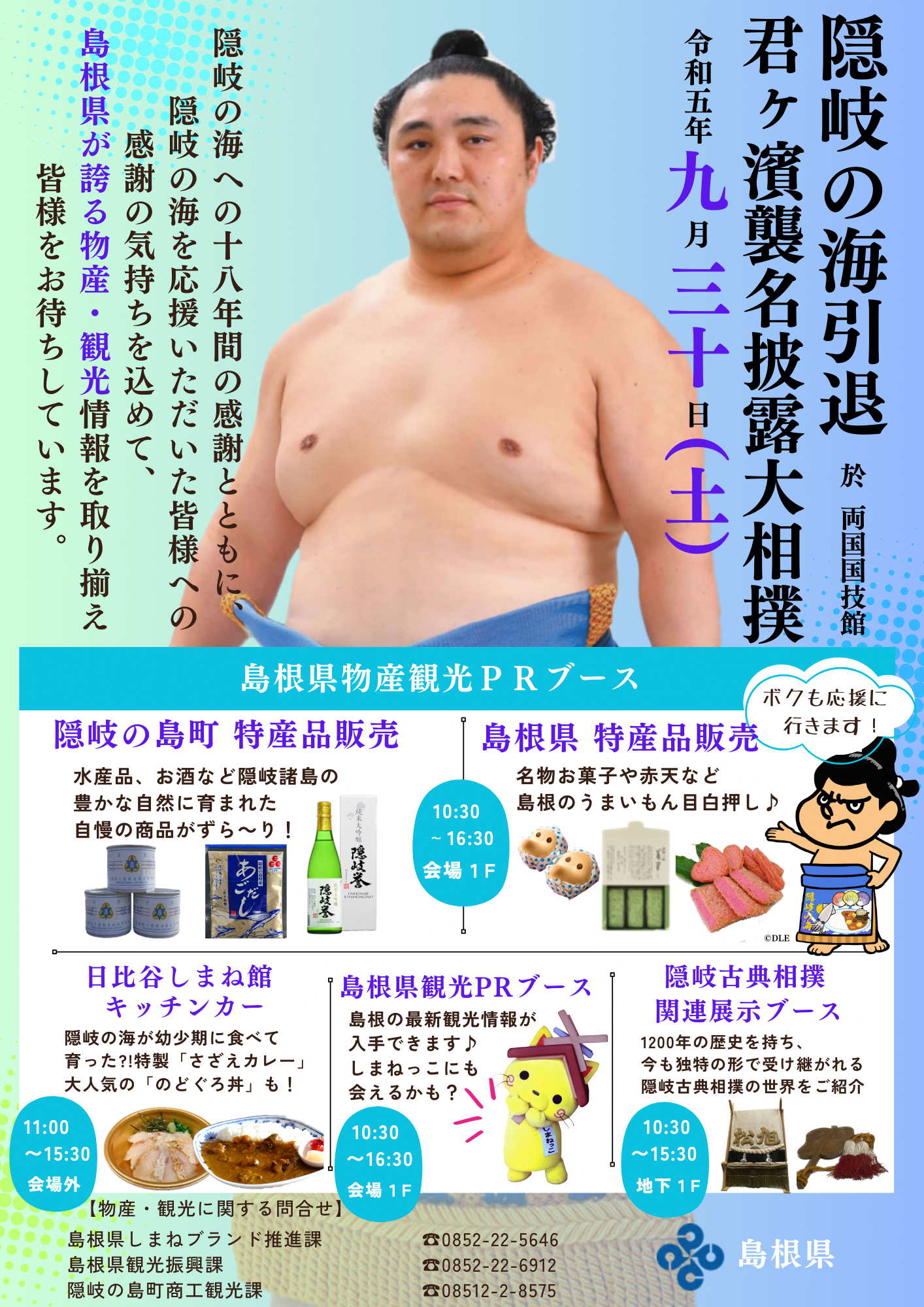 18年の長きにわたり島根県民の期待を背負い続け、最高位関脇という素晴らしい功績を残した隠岐の島町出身の隠岐の海関の断髪式会場において、隠岐の海関と、これまで隠岐の海関を応援してくださった方々への感謝の気持ちを込め、隠岐産品をはじめとした島根県産品の展示・販売や観光PRを行います。