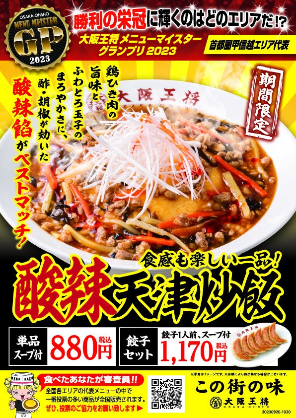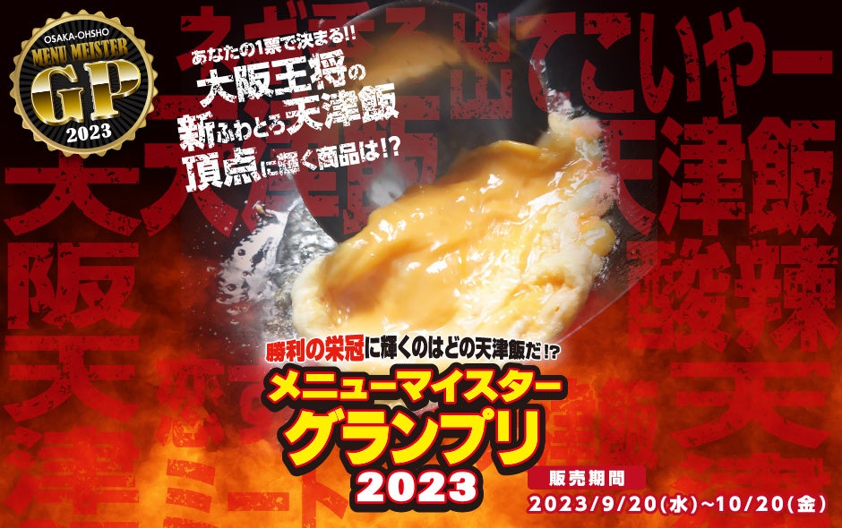 メニューマイスターグランプリとは、全国の大阪王将のスタッフがテーマに合わせてメニューを考案し、審査販売期間中にお客様から最も多くの支持を得たメニューだけが全国販売されるというグランプリ。コロナ禍により開催を見送ってまいりましたが、今年4年ぶりに開催いたします。2023年のテーマは、10月18日を「天津飯の日」として記念日制定されたことを記念して、“天津飯”に。メニューマイスターグランプリ2023は、全国5つの各エリアで勝ち残った逸品による、大阪王将の看板メニューの一つである『ふわとろ天津飯』の新たなメニュー誕生をかけた挑戦。あなたの一票で決まる新『ふわとろ天津飯』。気になるメニューをぜひ応援ください。