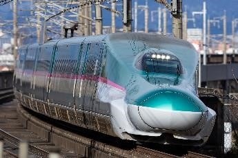 E5系は、最先端の技術を集結し、走行性能と信頼性、環境性能、快適性のすべてを高いレベルで融合させた新世代の新幹線車両です。エクステリアデザインは、ボディ上部をコーポレートカラーを意識した「ときわグリーン」、ボディ下部を「飛雲ホワイト」とし、その間に「つつじピンク」の帯を配して先進性とスピード感を表現したものとなっています。また、個性的なロングノーズは、環境性能を考慮した形状となっています。