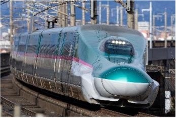 E5系は、最先端の技術を集結し、走行性能と信頼性、環境性能、快適性のすべてを高いレベルで融合させた新世代の新幹線車両です。エクステリアデザインは、ボディ上部をコーポレートカラーを意識した「ときわグリーン」、ボディ下部を「飛雲ホワイト」とし、その間に「つつじピンク」の帯を配して先進性とスピード感を表現したものとなっています。また、個性的なロングノーズは、環境性能を考慮した形状となっています。