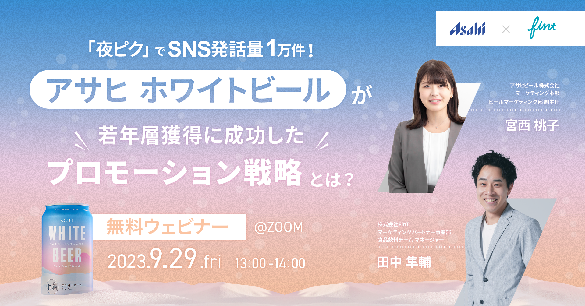 株式会社FinT(本社:東京都目黒区、代表取締役:大槻 祐依)は9月29日(金)13:00〜14:00より、「夜ピク」でSNS発話量1万件!”アサヒ ホワイトビール”が若年層獲得に成功したプロモーション戦略とは?と題して”アサヒ ホワイトビール”のブランド担当者様をお招きして共催ウェビナーを開催いたします。