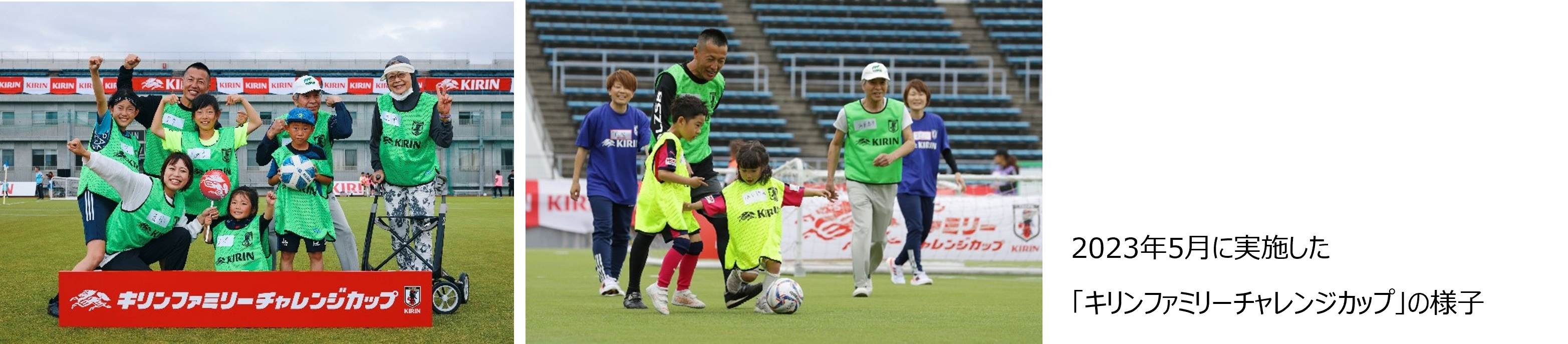 「キリンファミリーチャレンジカップ」は、「家族がチームになる日」をコンセプトに、2022年12月に高円宮記念JFA夢フィールド(千葉県千葉市)と、2023年5月にJ-GREEN堺(大阪府堺市)の2回開催してきました。大会では、これまで1歳~79歳の800人以上が参加し、幅広い年齢の人たちが、家族や仲間とチームを組み、一つのボールを中心にプレーを楽しみ、会場中にたくさんの笑顔が生まれました。3回目の開催となる今回に続き、今後も日本各地での開催を予定しています。