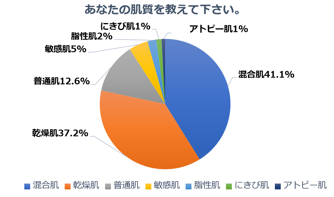 「あなたの肌質を教えてください。」と質問したところ、混合肌(油性肌+乾燥肌)と感じている方は41.1%、乾燥肌と感じている方は37.2%という結果になりました。この結果から、肌に乾燥しがちな部分があると感じている方は、78.3%と約8割にものぼることが分かりました。