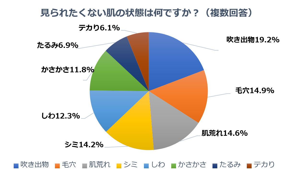 続いて、「見られたくない肌の状態は何ですか」と質問したところ、最も多い回答が「吹き出物」19.2%、続いて「毛穴」14.9%、「肌荒れ」14.6%、「シミ」14.2%、「しわ」12.3%、「かさかさ」11.8%、「たるみ」6.9%、「テカり」6.1%という結果になりました。