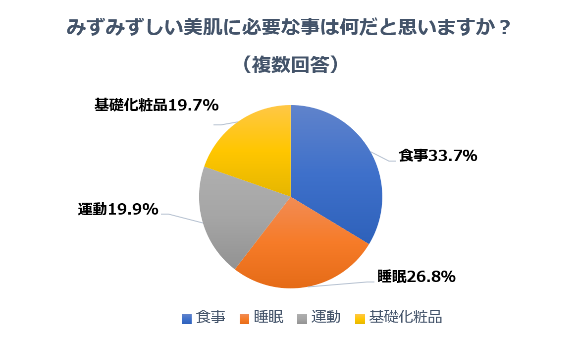 続いて、「みずみずしい肌に必要なことは何だと思いますか」と質問したところ、みずみずしい肌に必要なこととして、「食事」が必要だと考えている方は、33.7%と最も多く、「睡眠」が26.8%「運動」が19.9%、「基礎化粧品」が19.7%と最も低い結果となりました。