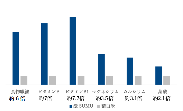 「澄 SUMU」は玄米加工品のため、ぬか層や胚芽を含んでいます。そのため、白米に比べ、食物繊維は約6倍、ビタミンEが約7倍、マグネシウムは約3.5倍※と栄養素を多く含み、栄養バランスに優れています。