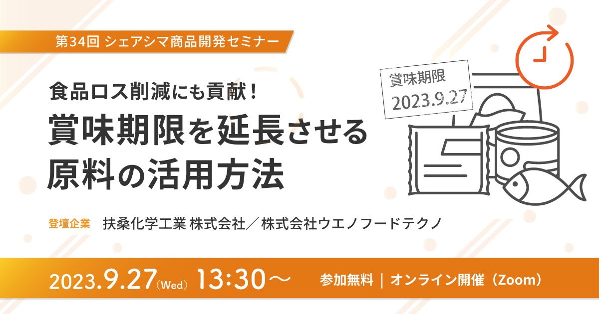 2023年9月27日(水)に開催する第34回セミナーは、「賞味期限を延長させる原料の活用方法」がテーマです。食品の安全性を確保するために重要な「賞味期限」。近年、食品ロス削減が推進される中、食品のロングライフ化が求められています。当セミナーでは、賞味期限を延長させる食品原料とその活用方法について登壇企業様にご紹介いただきます。