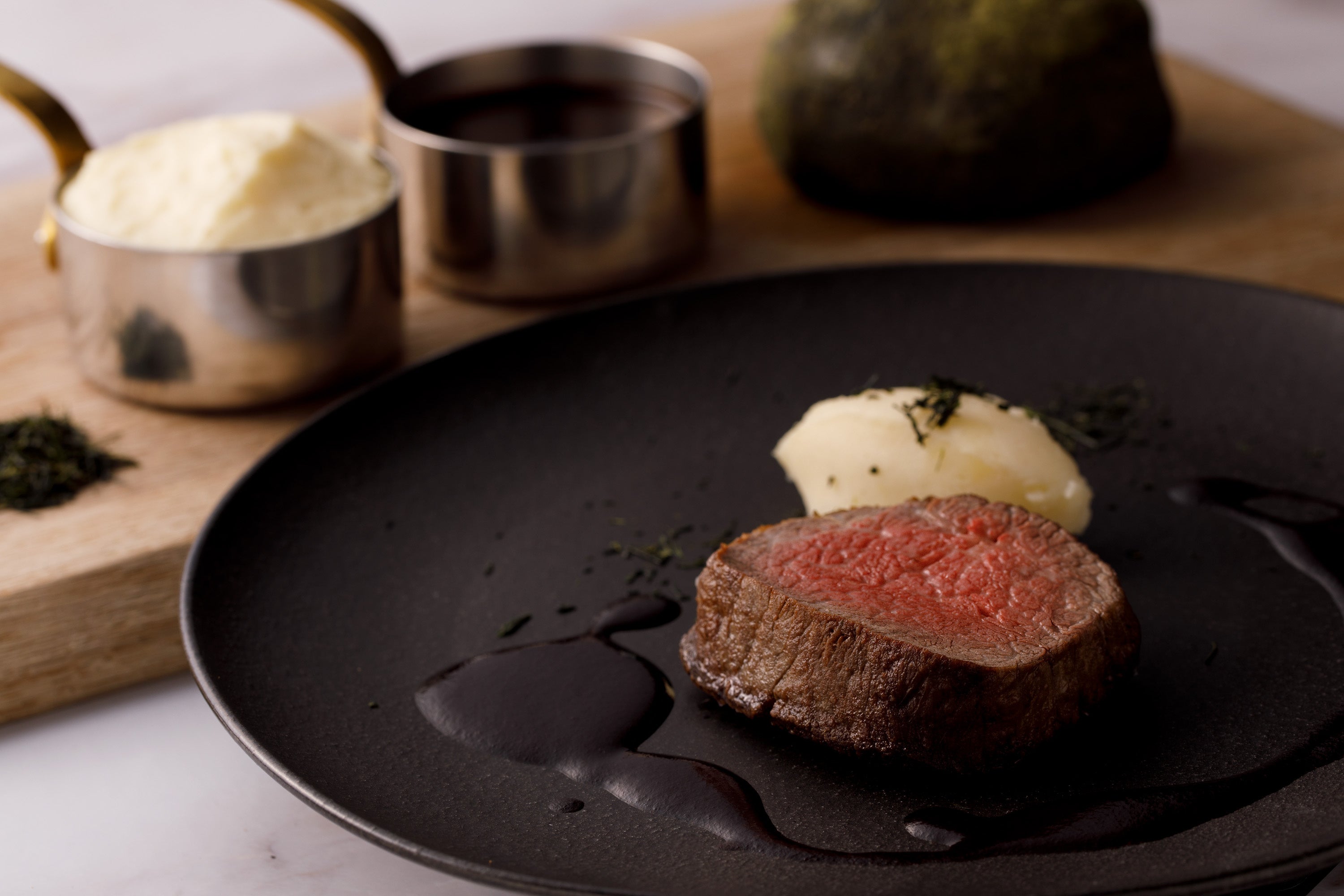 八女極上煎茶で丸一日マリネした上に、さらに八女極上煎茶で包み焼きすることで、煎茶の香りと風味をしっかりとうつした九州産牛フィレ肉は、ゲストの前で包みを外し、カットして提供します。包み焼きをすることで、煎茶の香りと肉の旨味を逃すことなくじっくり火が入り、柔らかく仕上がります。