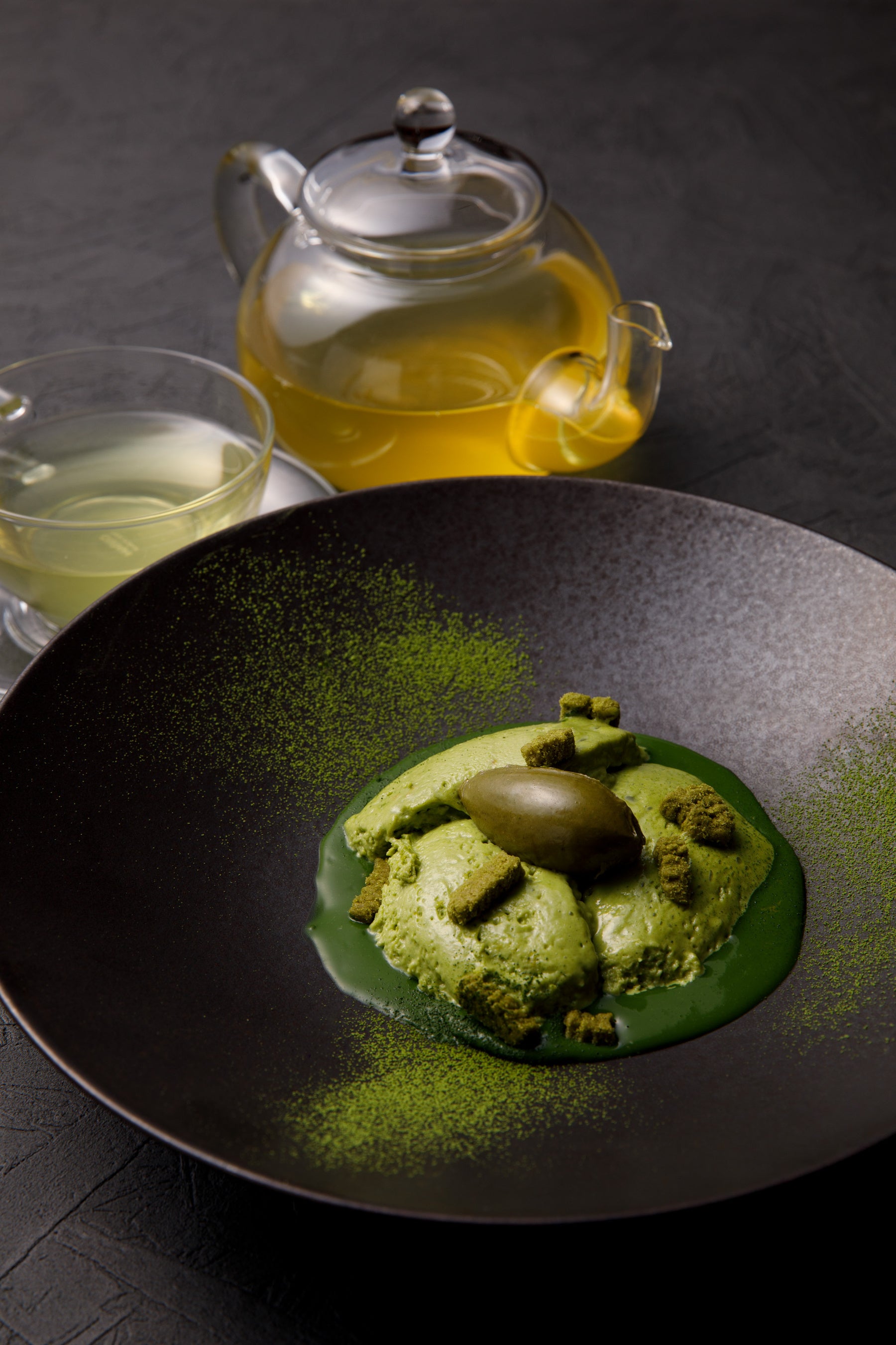 ムース、ソルベ、ソース、クランブルクッキー全てに八女伝統本玉露を使用した、玉露尽くしのデザート。