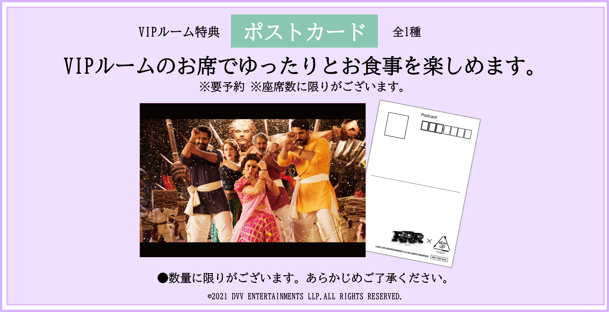 映画『RRR』のVIPルームでしか見ることが出来ない特別な装飾を楽しみながら、ゆったりとしたお食事が可能です。またVIPルームをご利用のお客様にはオリジナルポストカード(全1種)を1枚プレゼントします。