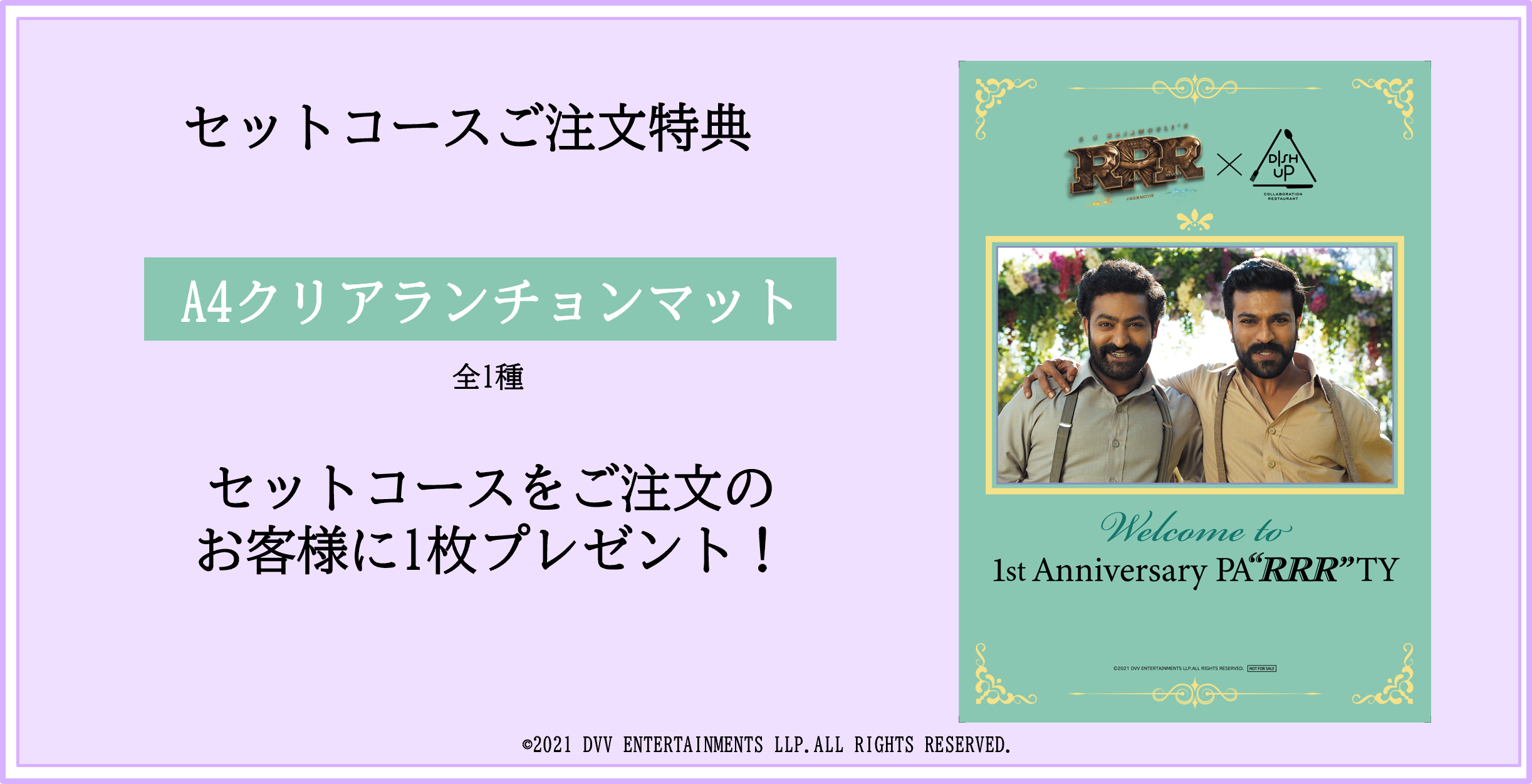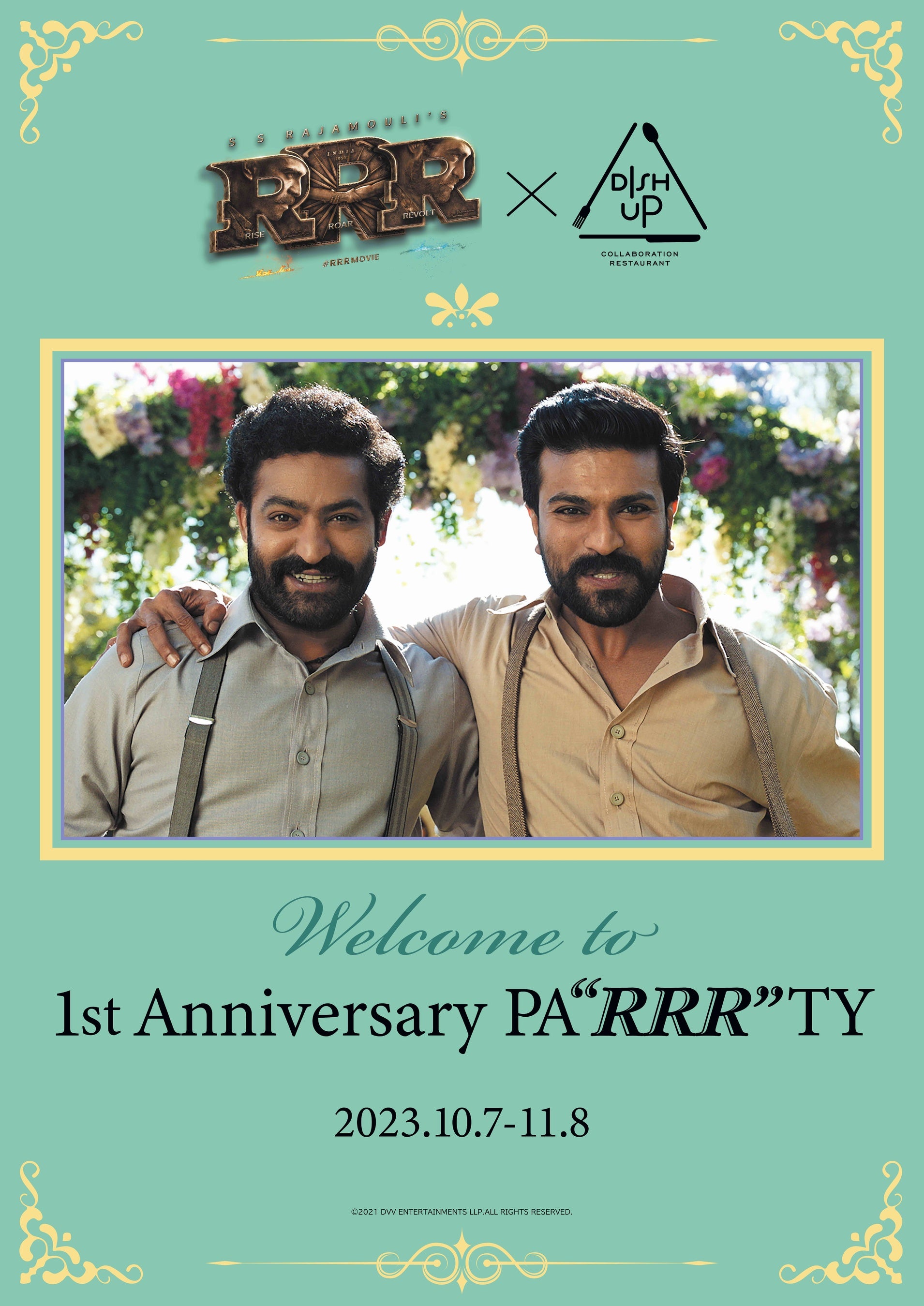 今回は映画公開1周年記念として「1st Anniversary PA“RRR”TY」と題し、あのナートゥダンスシーンのパーティー会場をコンセプトにコラボを開催。まさにパーティーに相応しい華やかな空間で、前回コラボ時の人気メニューとは別に開発した新メニューと、DISH UP限定の新グッズ販売も予定している。