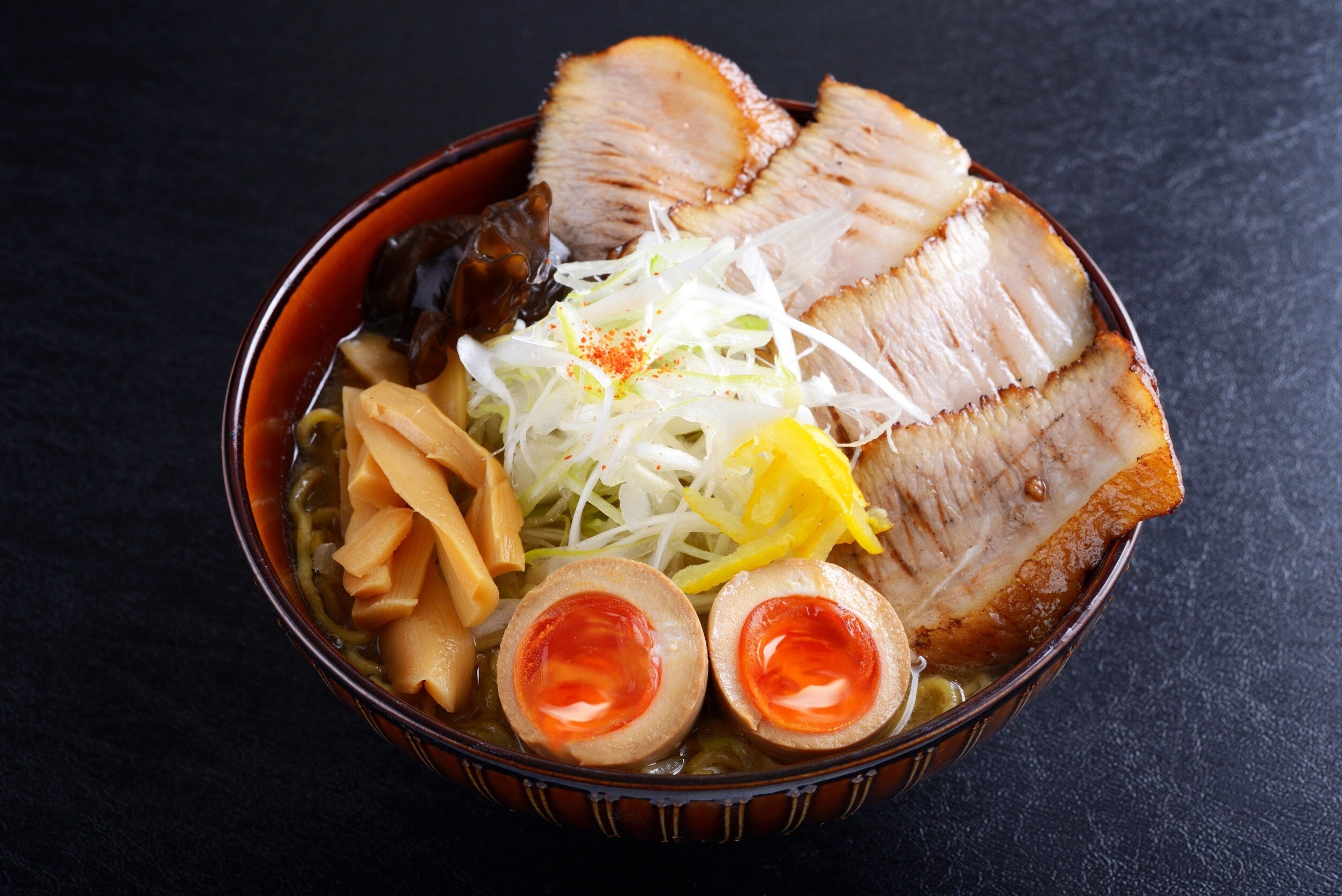 中華鍋でひき肉や野菜を香ばしく炒め、特製味噌ダレと鶏ガラスープを合わせた王道の札幌味噌らーめんに、炙った豚バラ肉や豚トロチャーシューがのったらーめんを楽しめます。